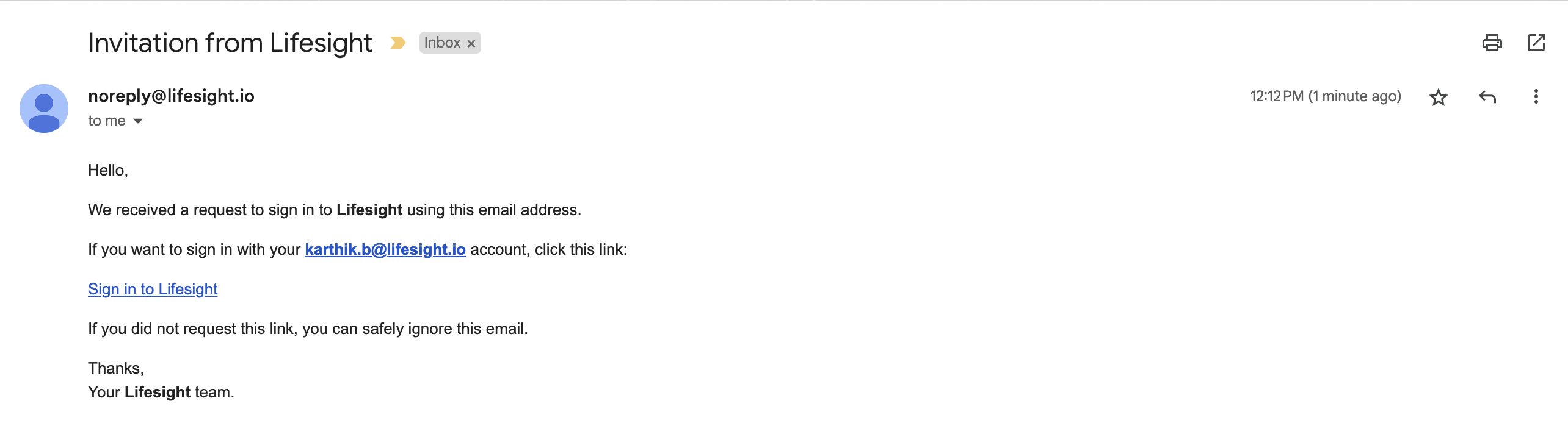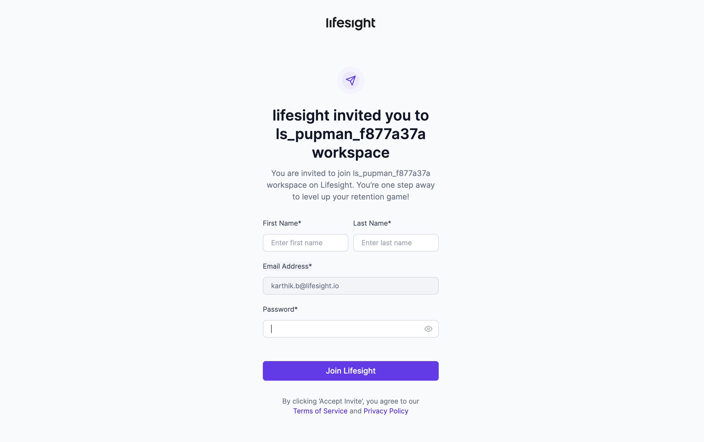 - The invited user gets a signup email immediate with the subject line: Invitation from Lifesight