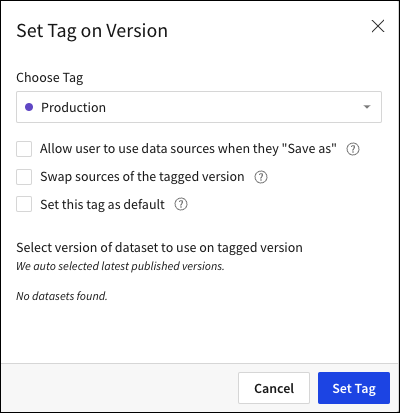 If your Dashboard uses a data model as the data source and you want the tagged Dashboard version to use a different data source than the published version, first tag the data model and swap the source of the tagged data model, then tag the Dashboard and use the tagged data model as the source.
