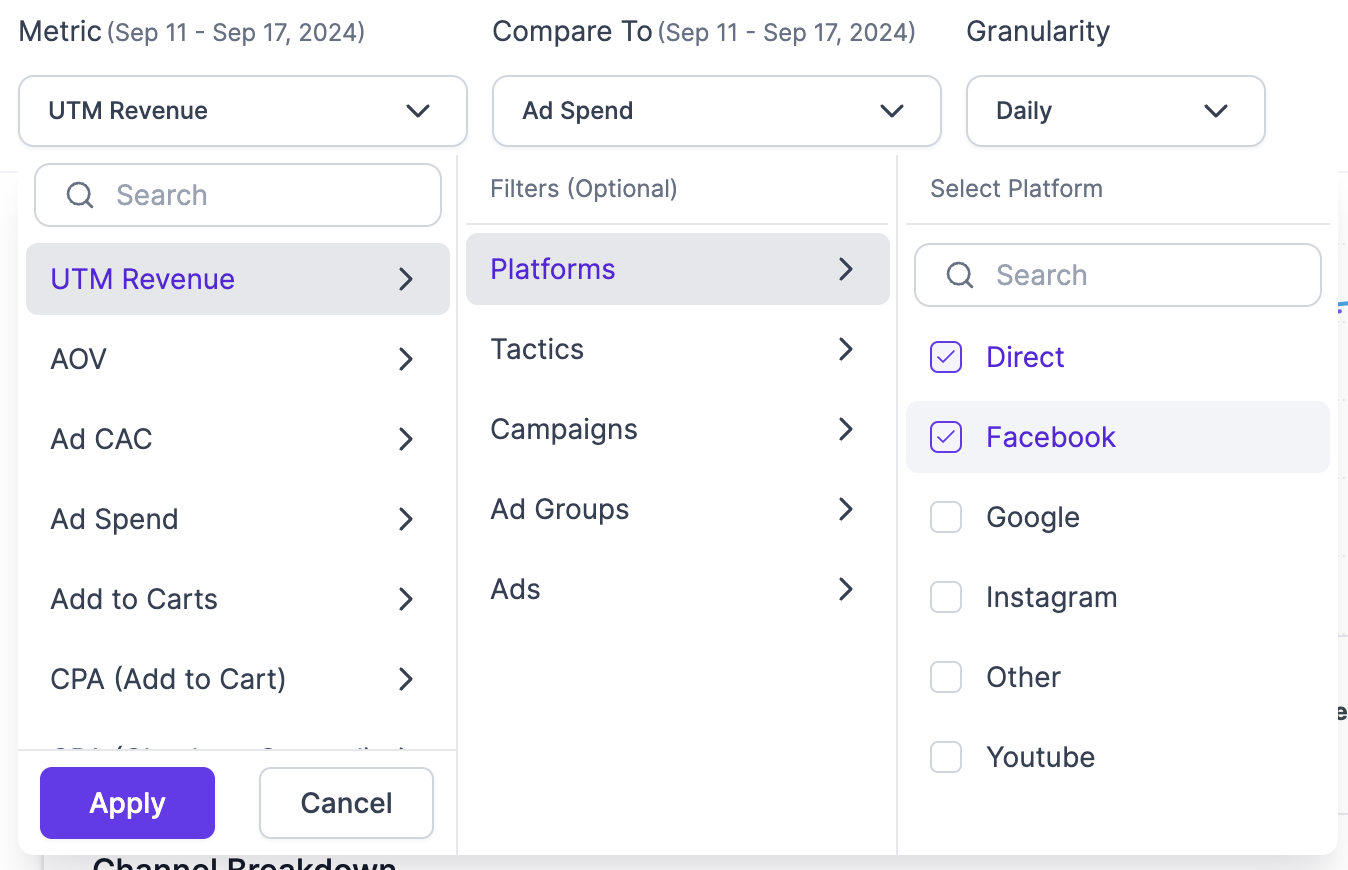 - Different metric - Choose any other metric like Revenue or NC Revenue across any channel or sub-campaign granularity from across your connected Attribution channels.