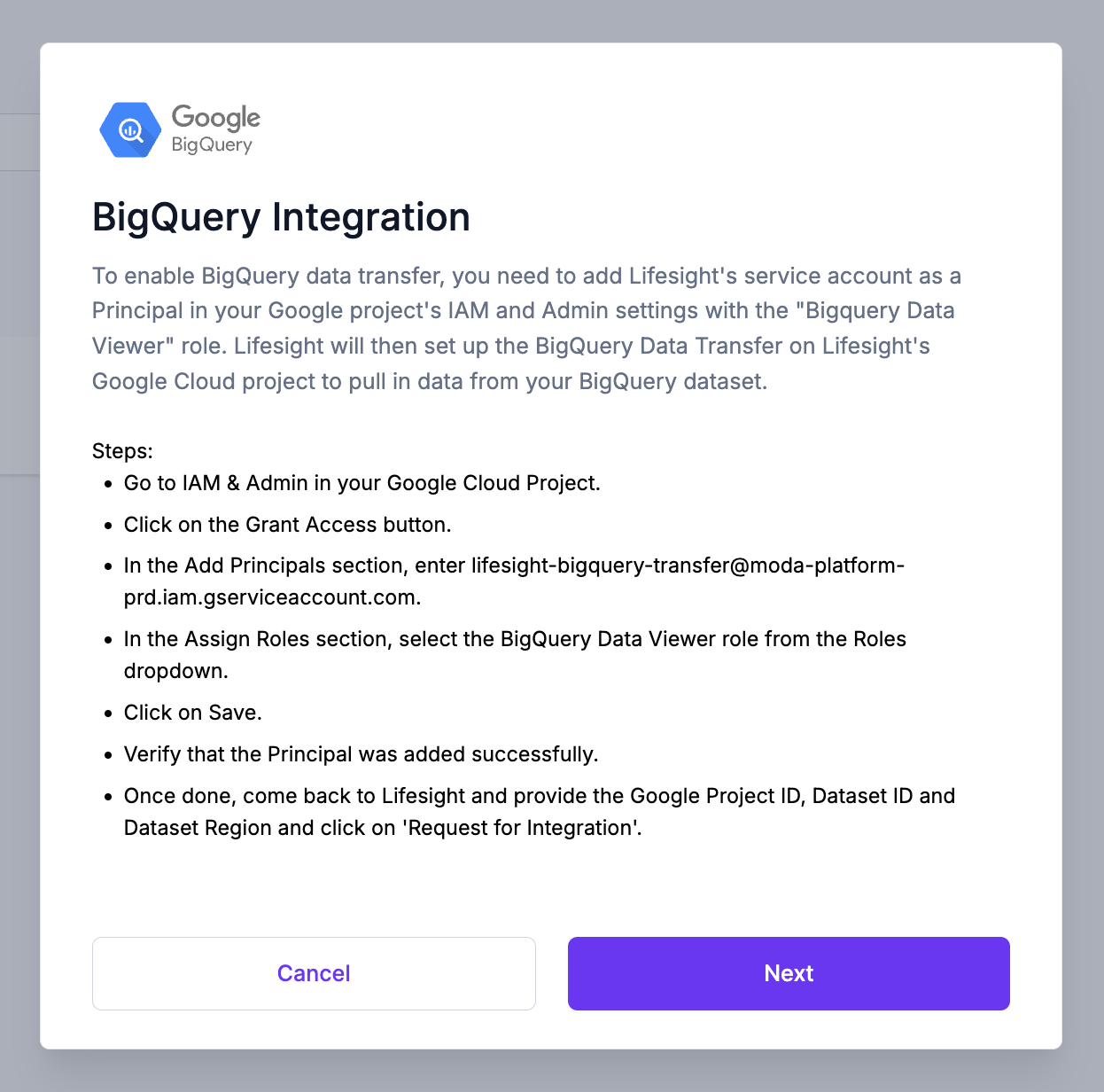 To enable BigQuery data transfer, you need to add Lifesight's service account as a Principal in your Google project's IAM and Admin settings with the BigQuery Data Viewer role. Lifesight will then set up the BigQuery Data Transfer on our Google Cloud project to pull in data from your BigQuery dataset.