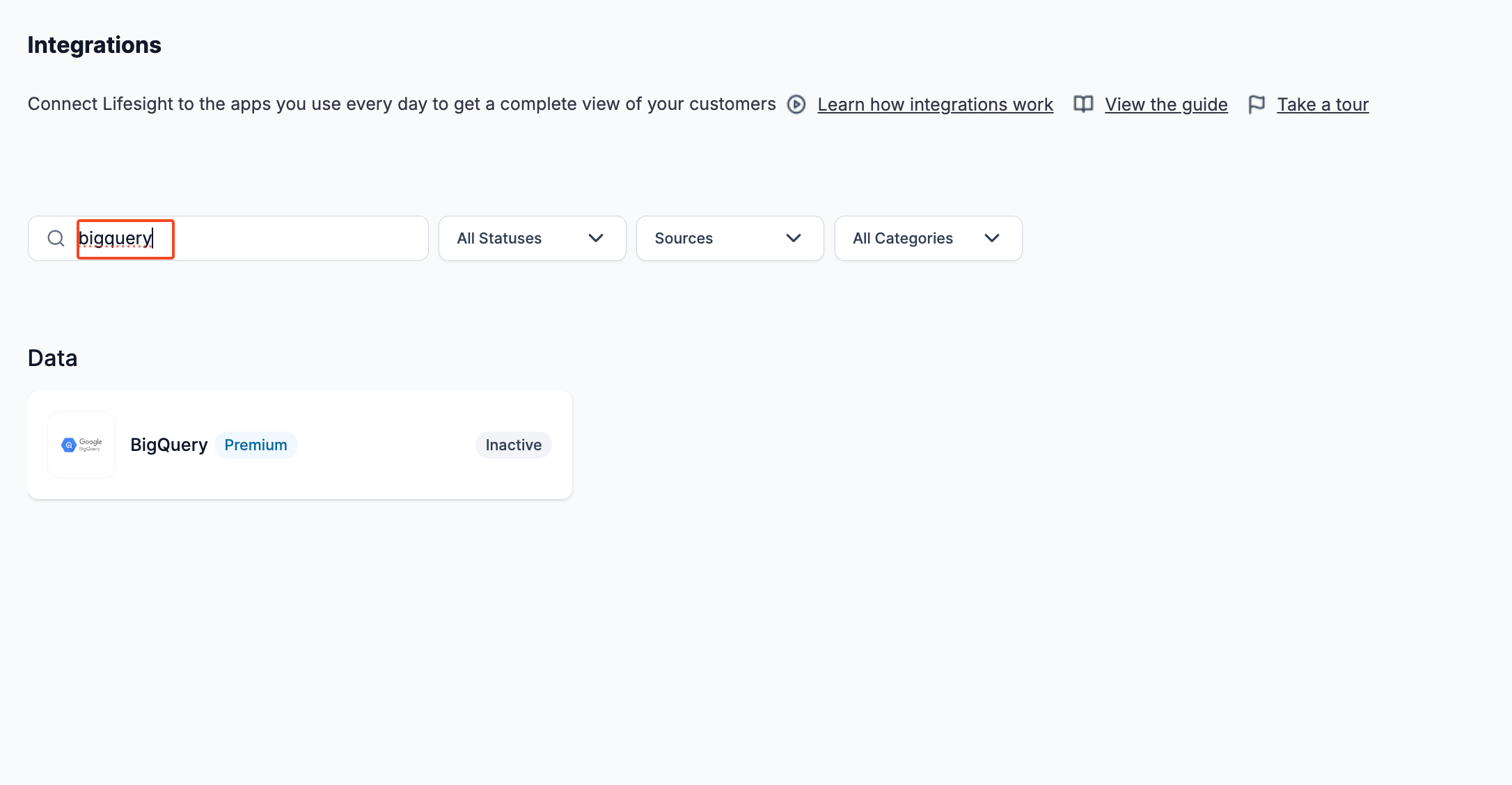 In the search field, type in "BigQuery" to locate the integration for this application.