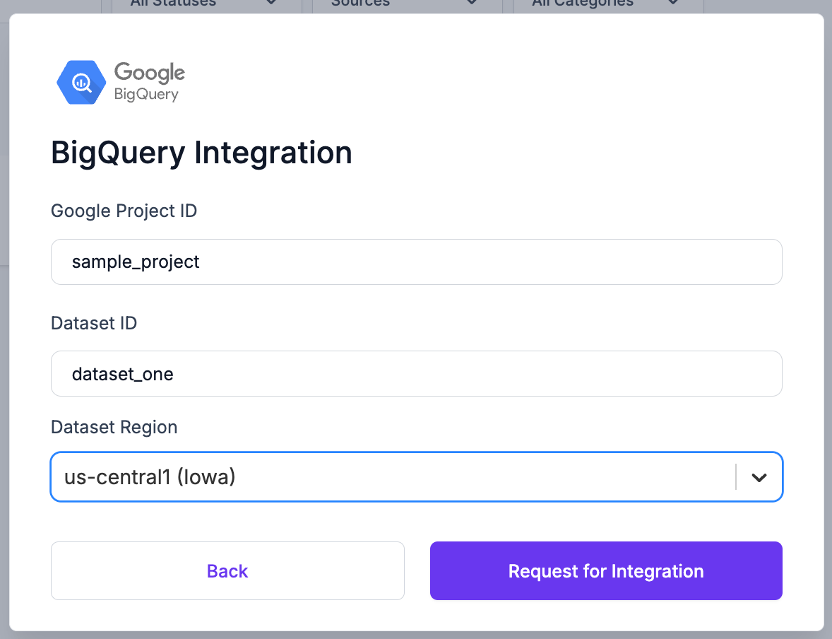 Enter the Google Project ID, Dataset ID, and pick the Dataset Region from the dropdown