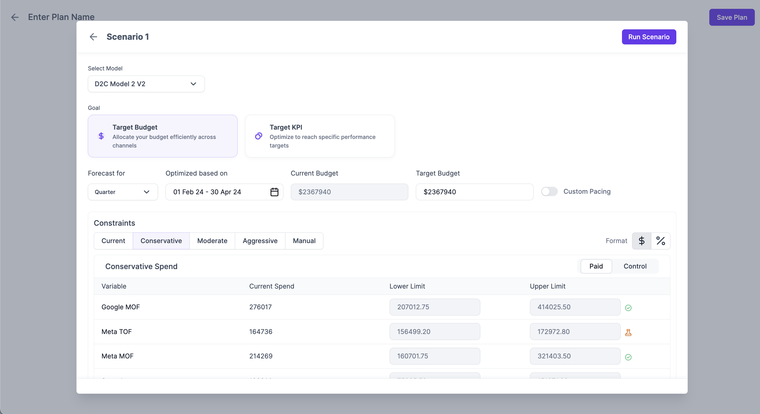 Constraints set realistic boundaries for how the scenario planner can allocate your budget. You can use presets or define them manually.