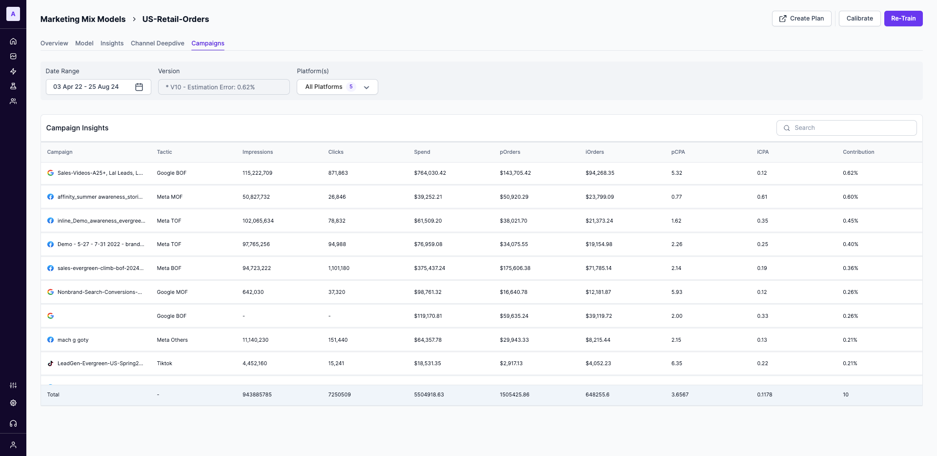 The Campaigns tab provides the most granular view of your Marketing Mix Model (MMM) results. After the model processes all your marketing and sales data, this is where you can see precisely how it attributes performance to each individual campaign. Use this view to identify your most effective marketing activities, understand their true incremental impact, and inform your future campaign-level budget allocation strategies.