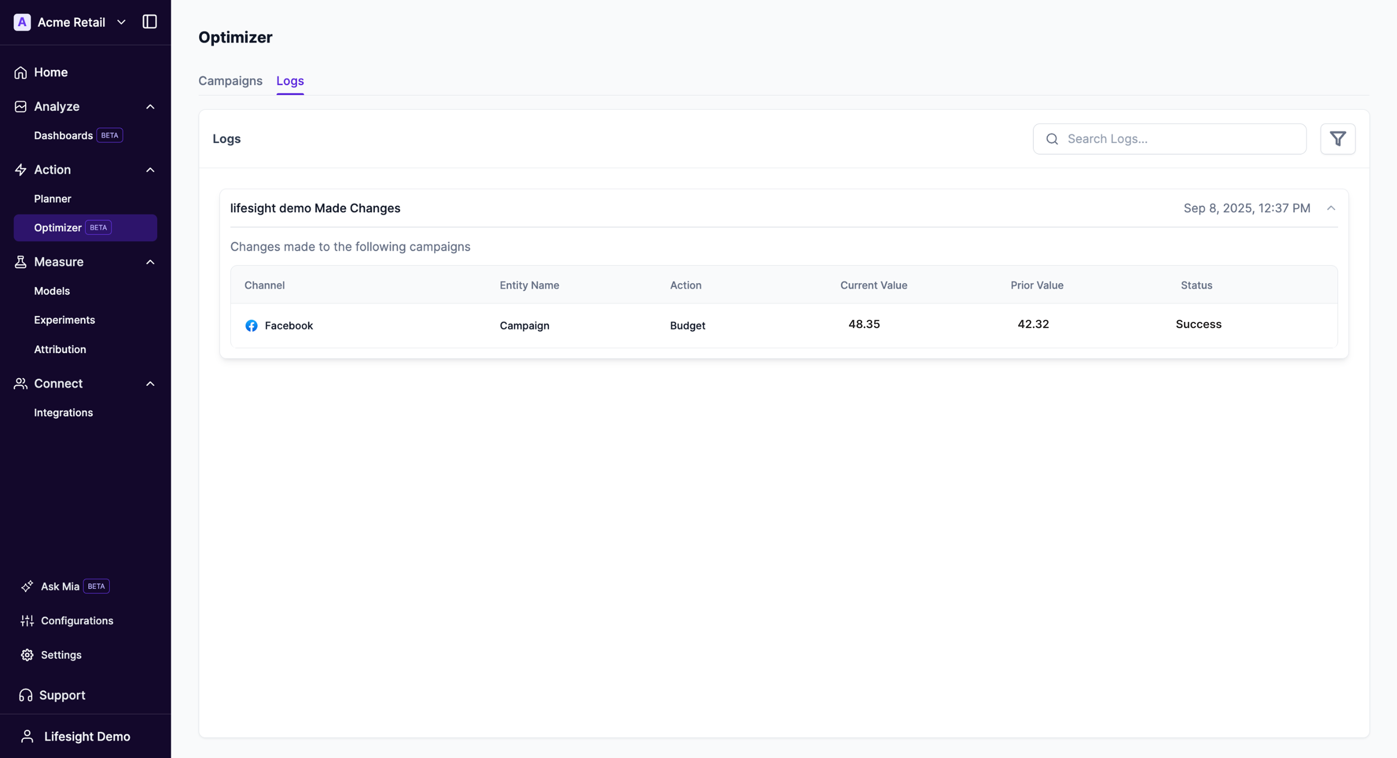 Manual vs. Automatic ChangesThe logs capture both manual adjustments you make directly within the Optimizer and automated changes applied by the platform based on accepted recommendations. This ensures a complete audit trail of all optimization activities.