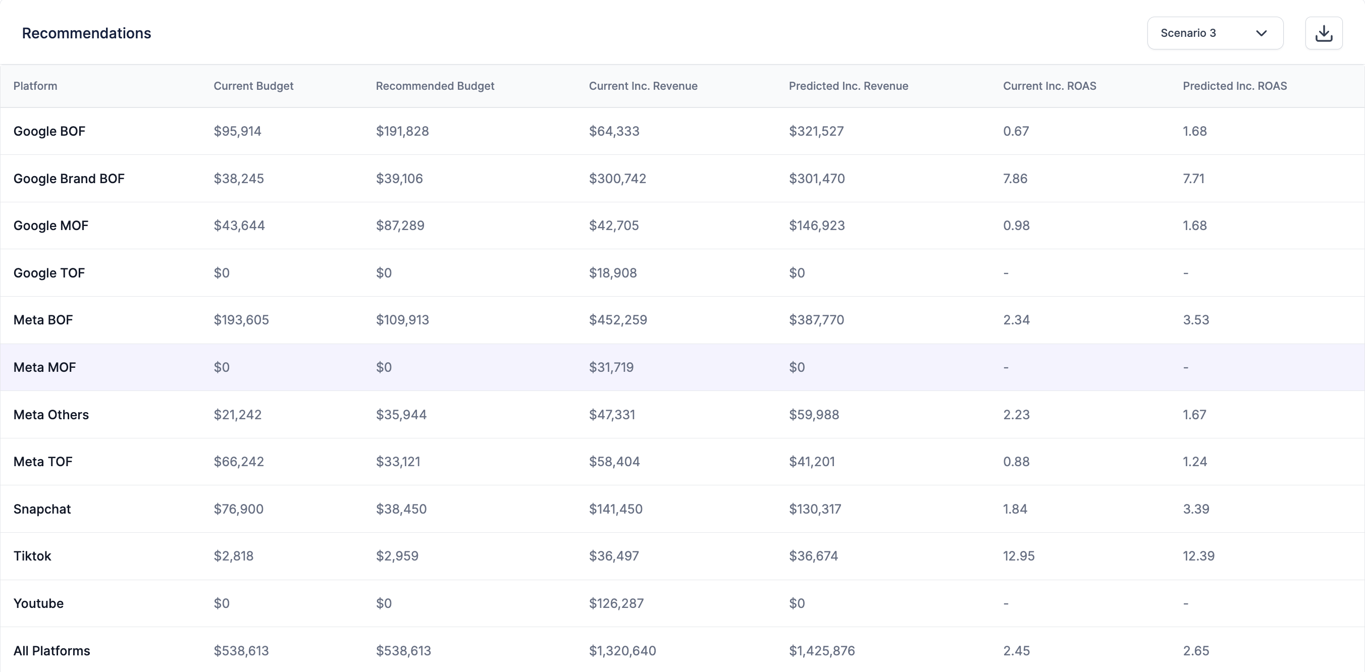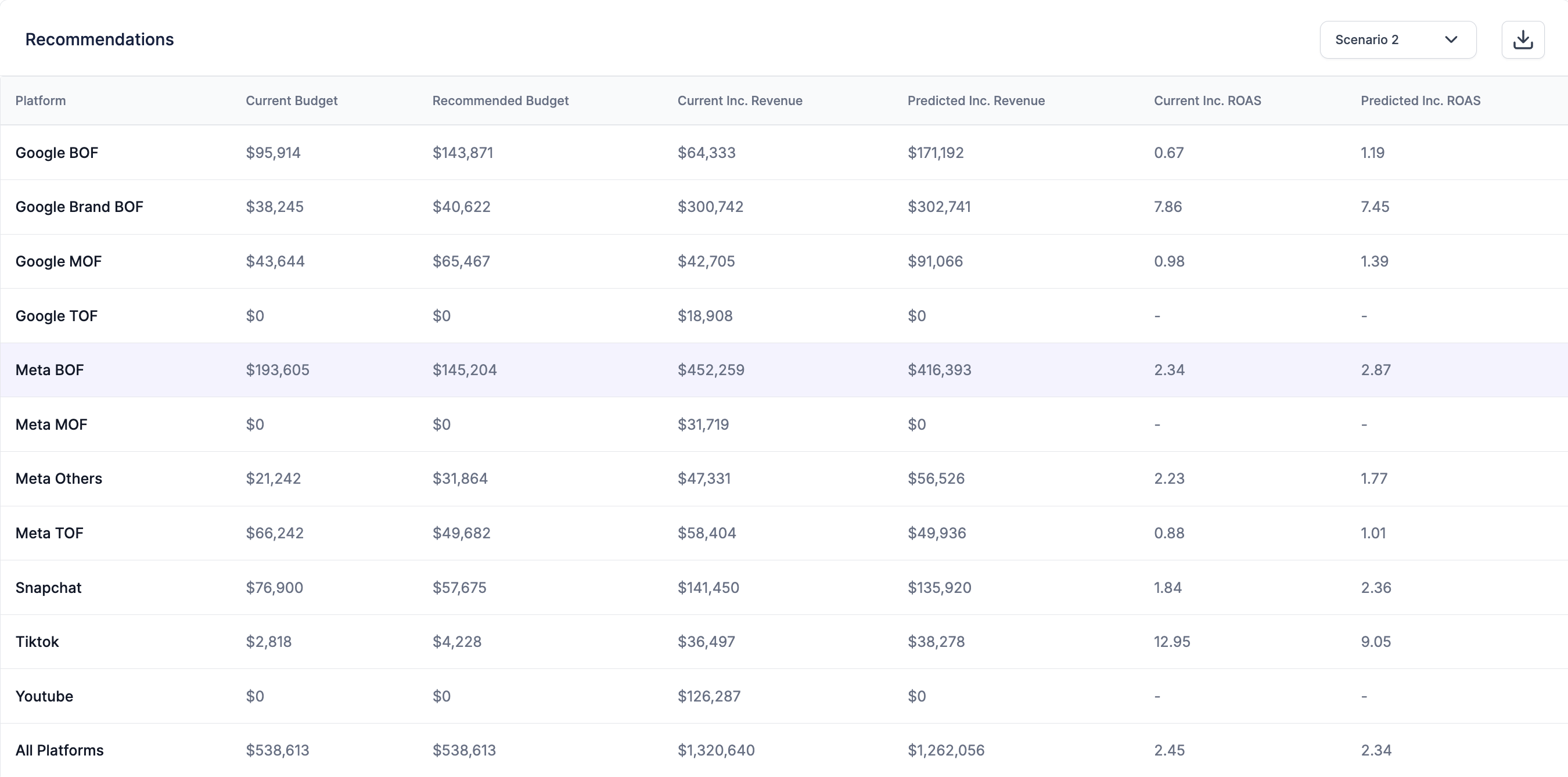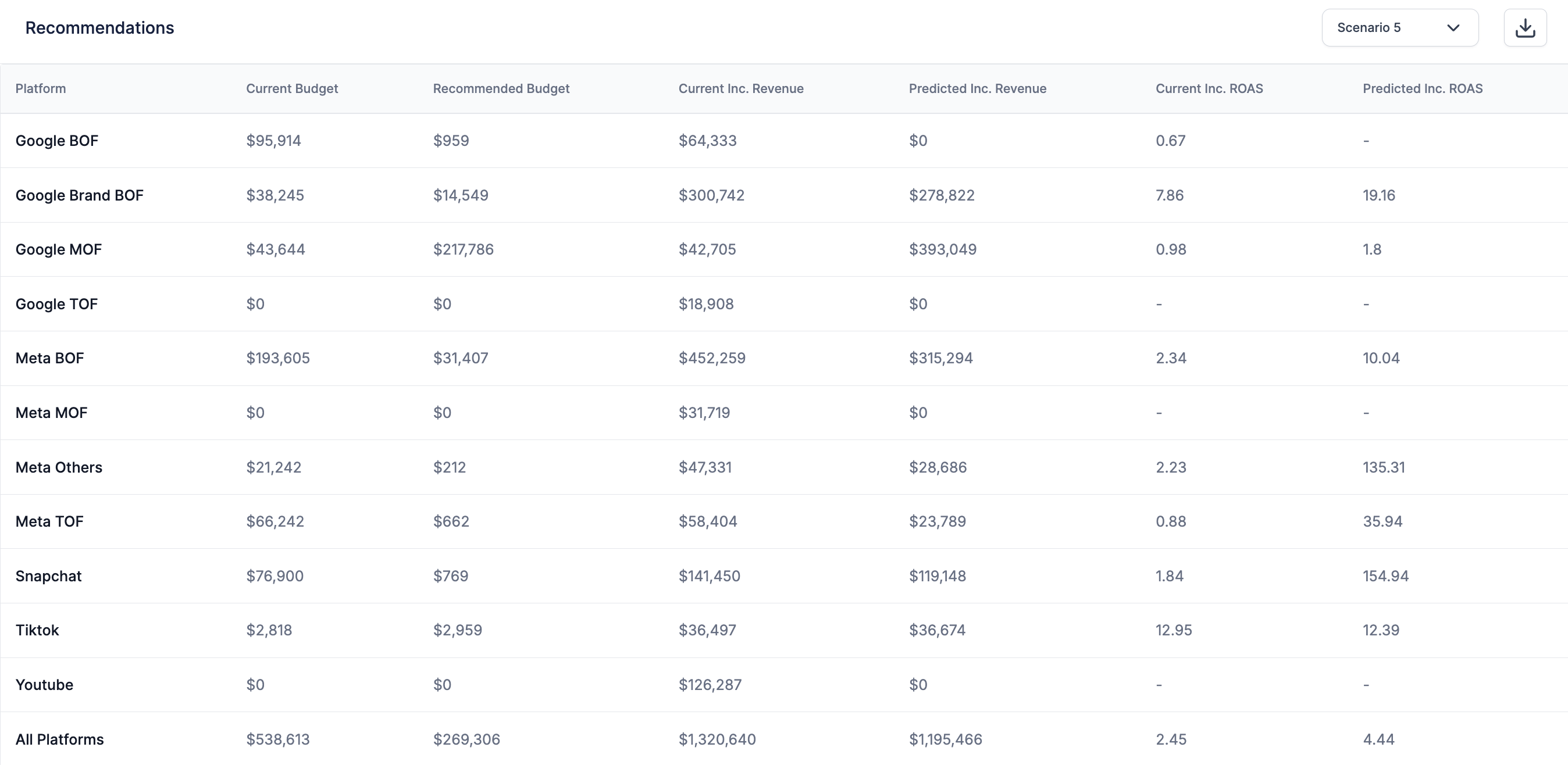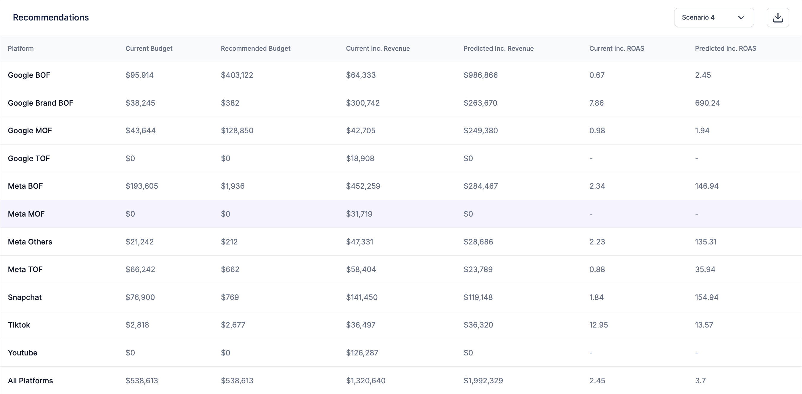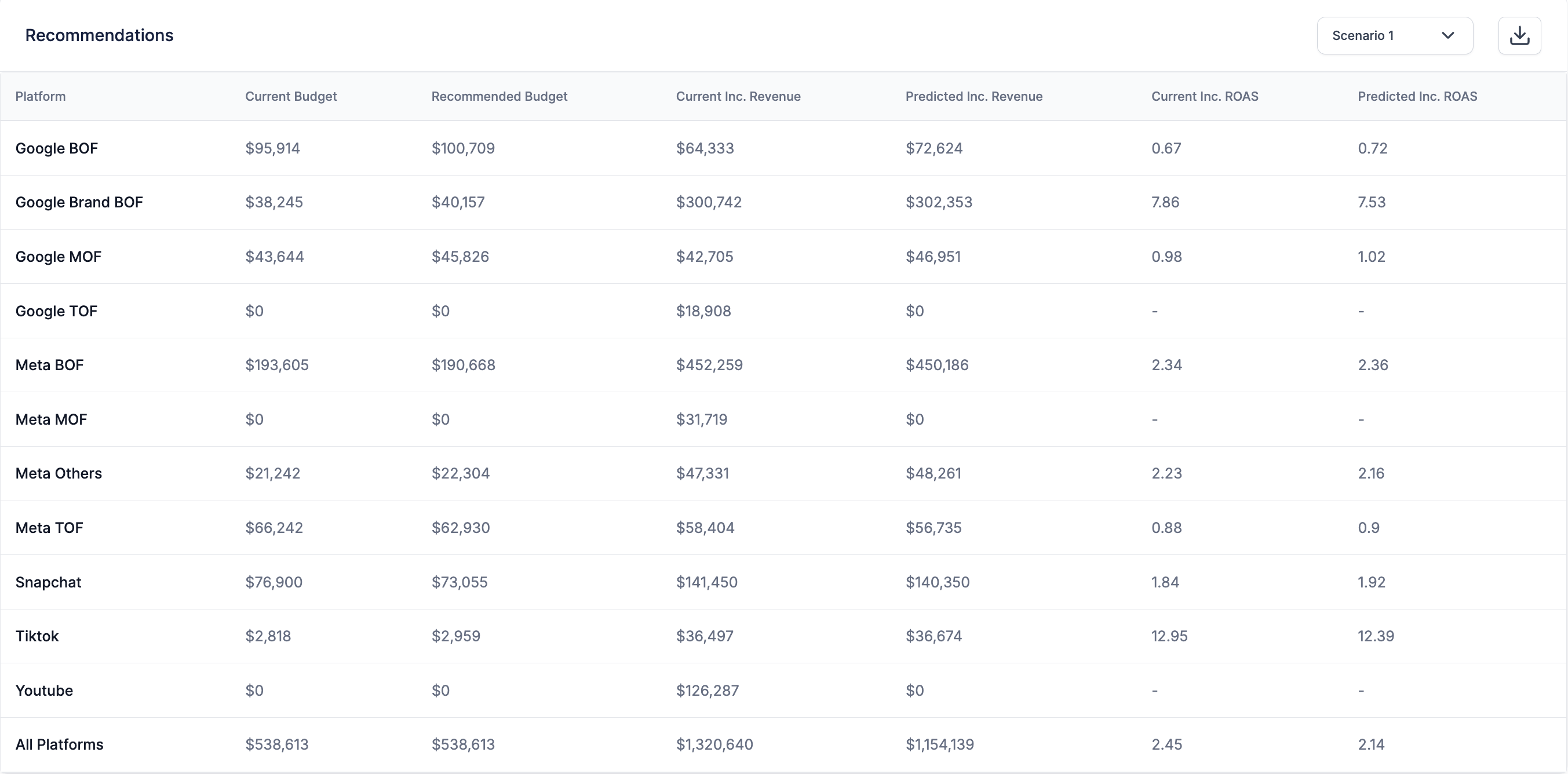 - The forecasted revenue and recommendations using the Current Constraint are as follows for Scenario 1: