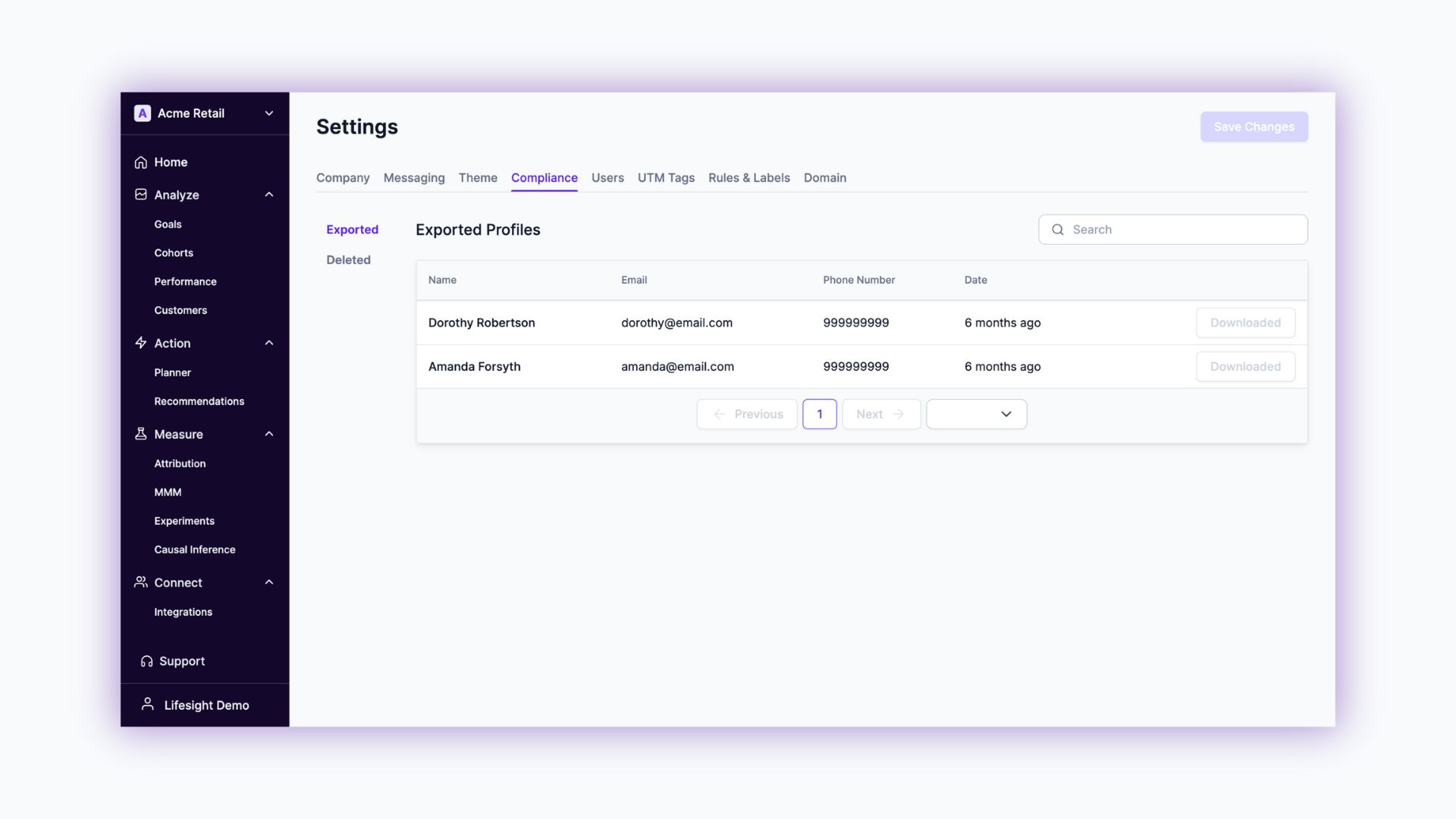 - The status of the request and the file to download can be viewed in "Settings → Compliance → Downloaded".