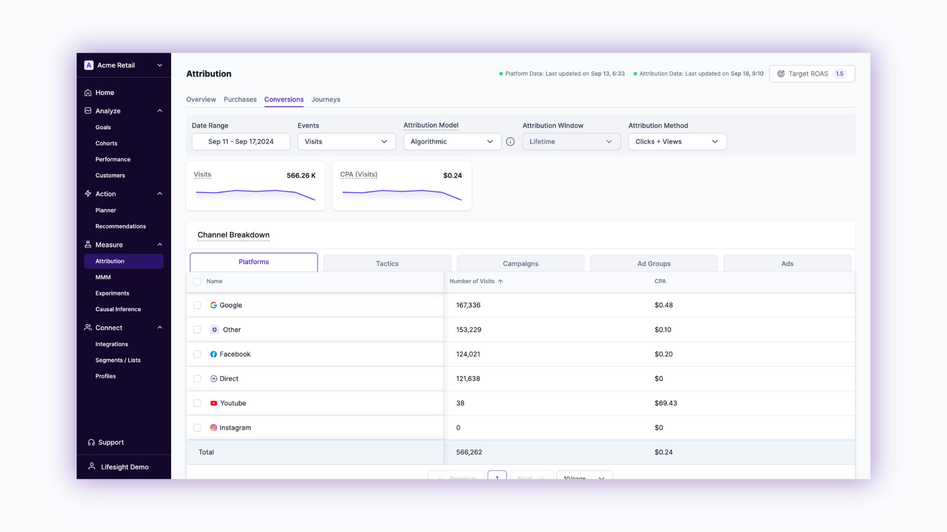 The Conversions tab on the Attribution Dashboard offers detailed insights into user behavior, extending beyond mere purchase transactions and analyzing non-purchase events. Whether you're analyzing visits, add-to-cart actions, initiated checkouts, form submissions, or signups, the Conversions tab offers a detailed and comprehensive view of how these events contribute to your overall marketing goals.