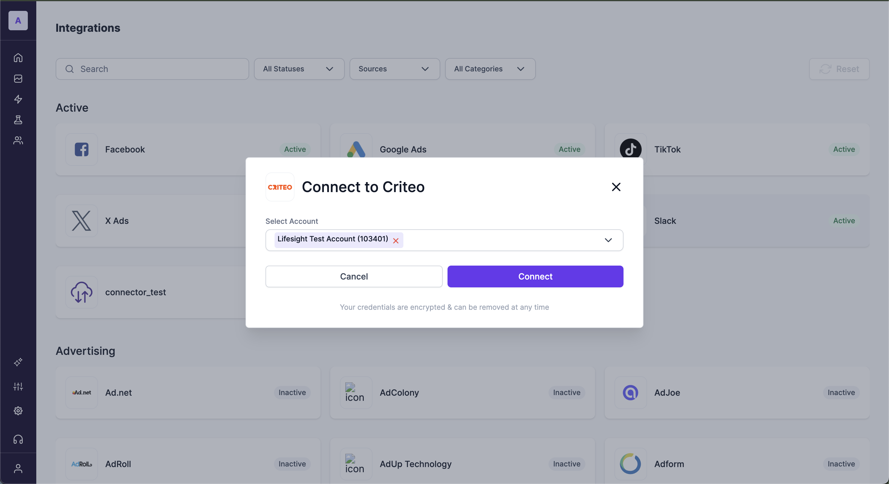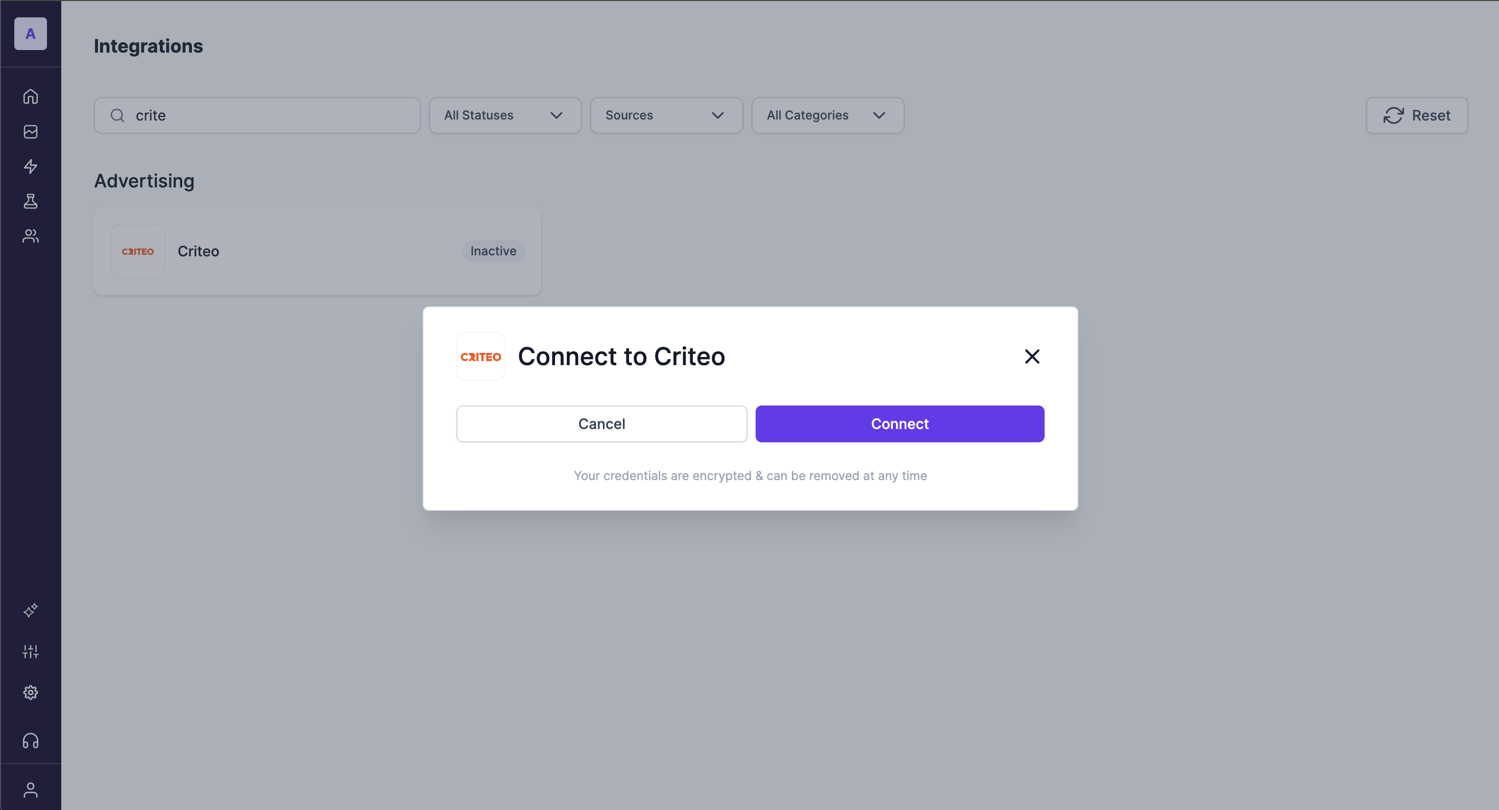 Confirm and Finish Click Connect to finalize the setup. The Criteo integration will now show as "Active" on your Integrations page.