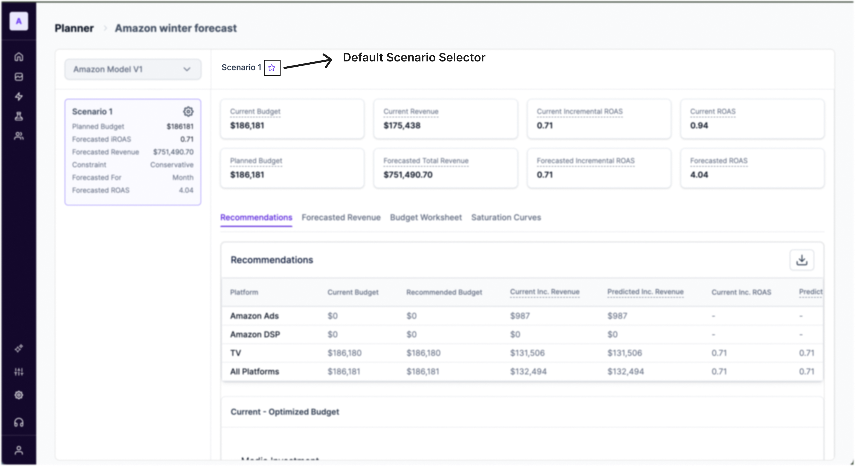 The Default Scenario in any plan acts as your strategic north star. It represents the primary, most crucial version of your marketing plan that you intend to follow and optimize against. By designating a Default Scenario, you define which set of goals, budgets, and constraints should be used as the baseline for generating powerful, data-driven recommendations.