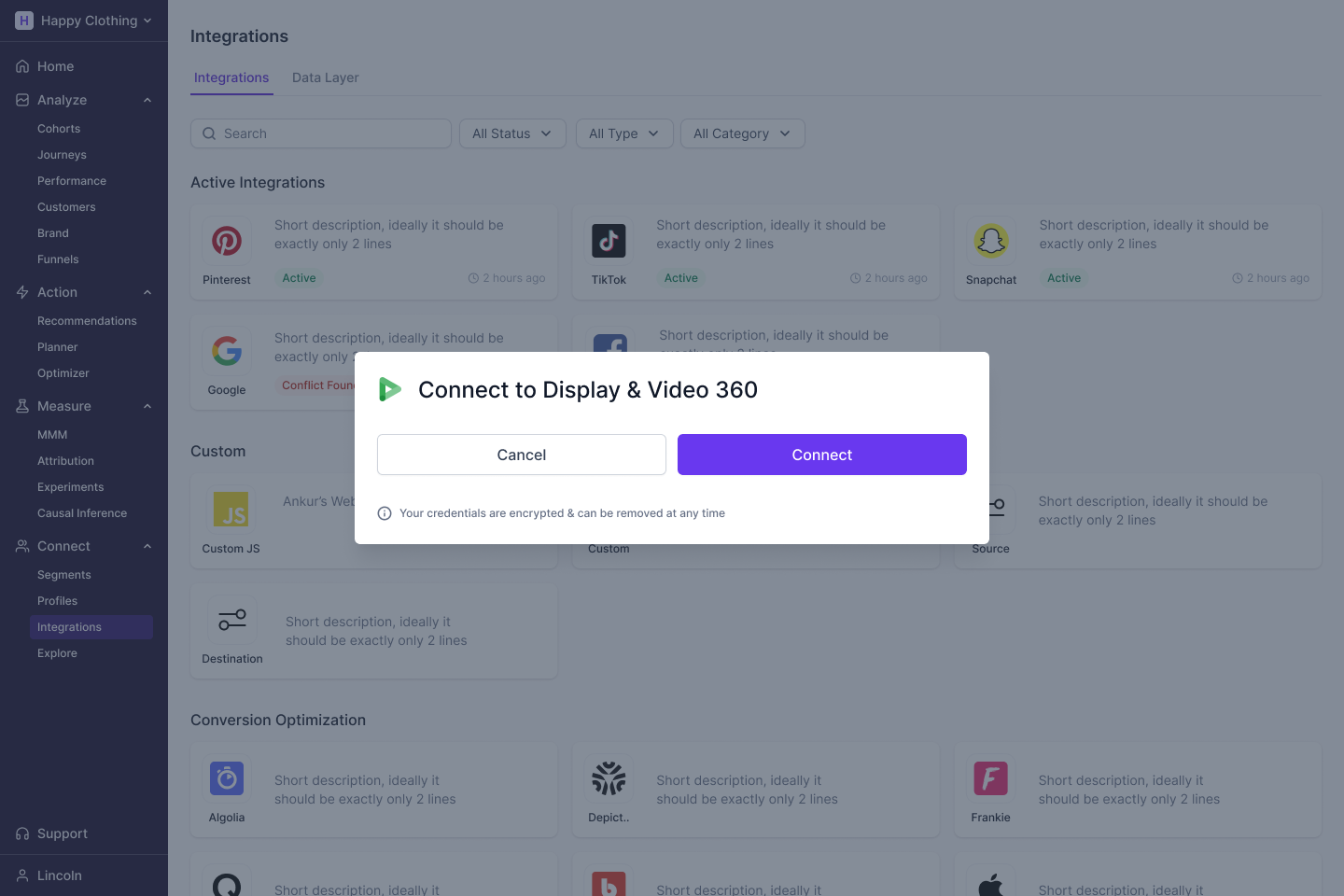 - Go to Connect > Integrations page from the navigation bar on the left.