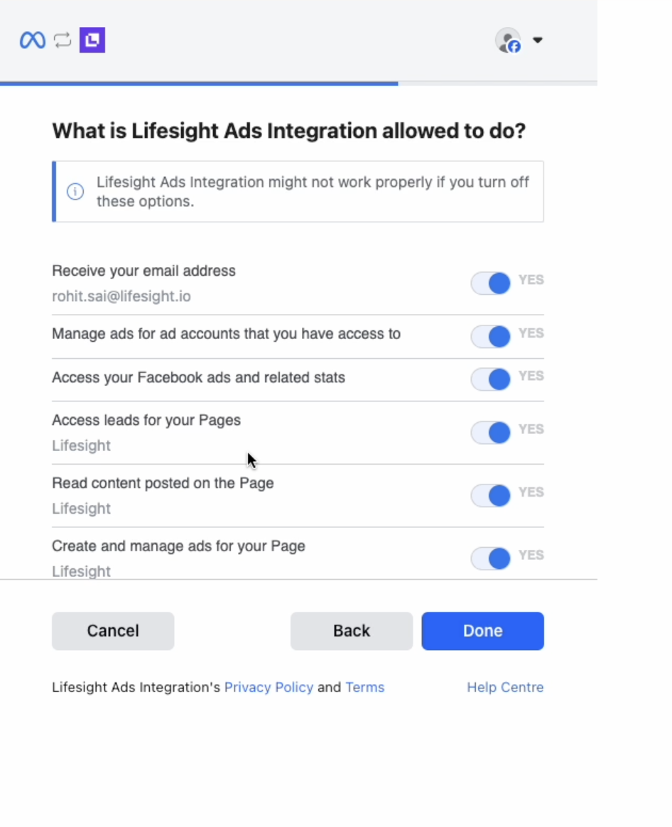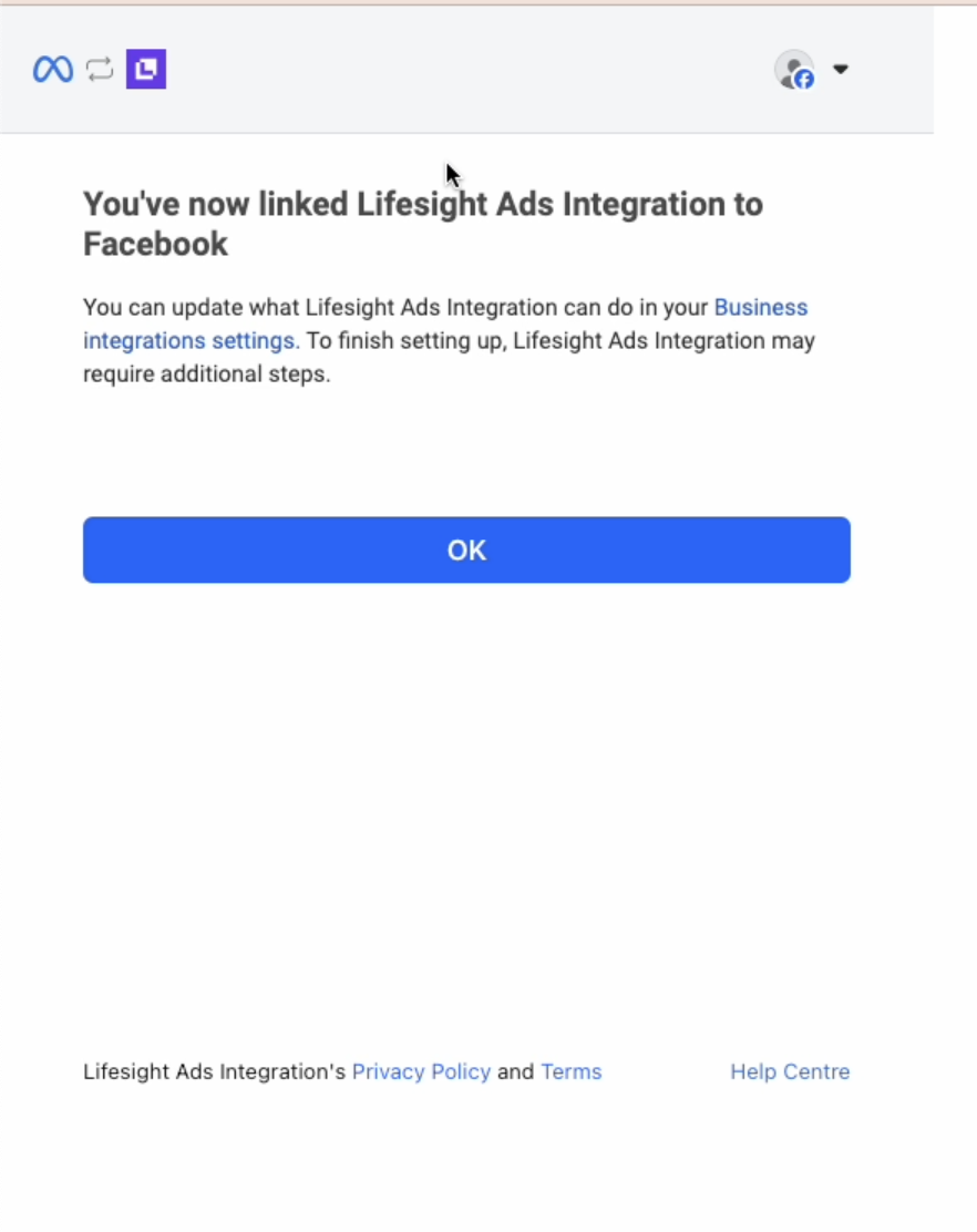 - You'll receive a success message in Facebook. Click Ok to be redirected to Lifesight.