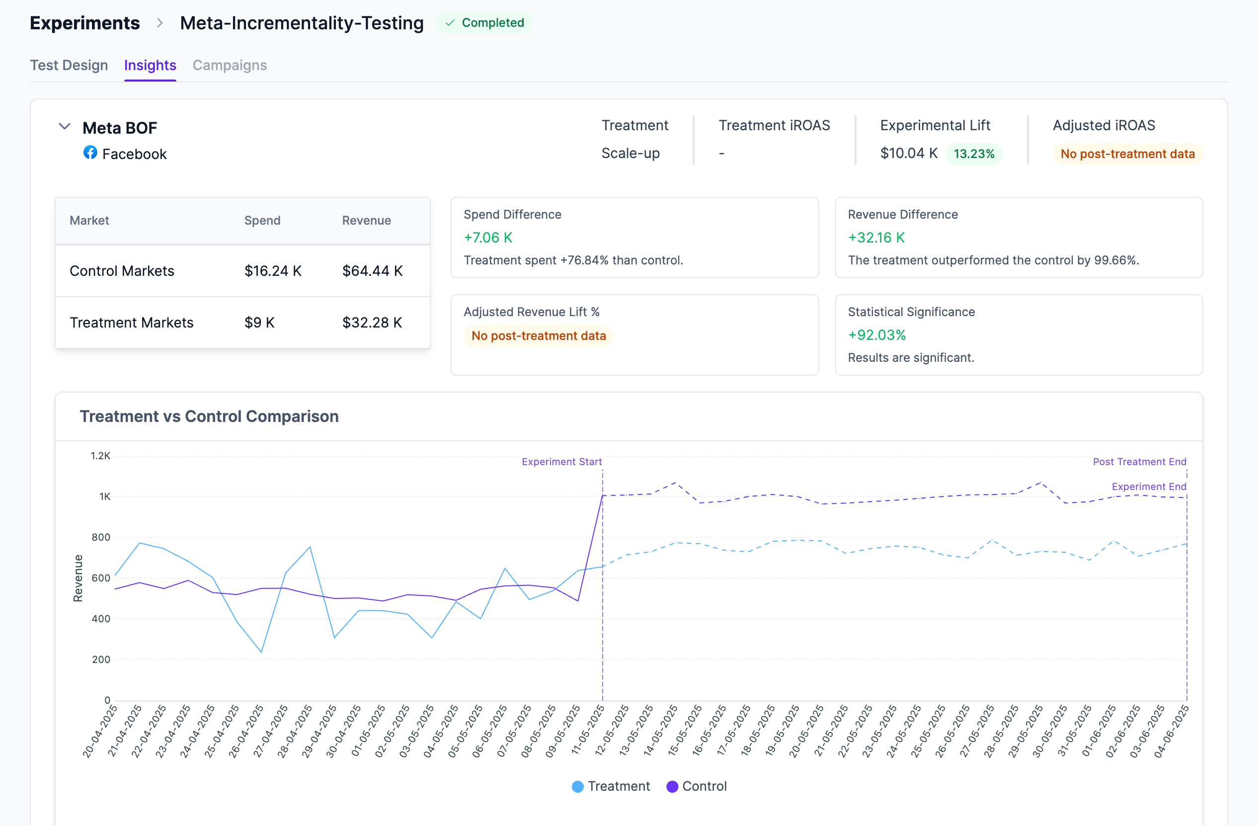 Adjusted Incremental ROAS (Adj. iROAS) is calculated as the (difference in revenue between treatment and control including the post-treatment period) divided by (difference in spend between the treatment and control including the post-treatment period).