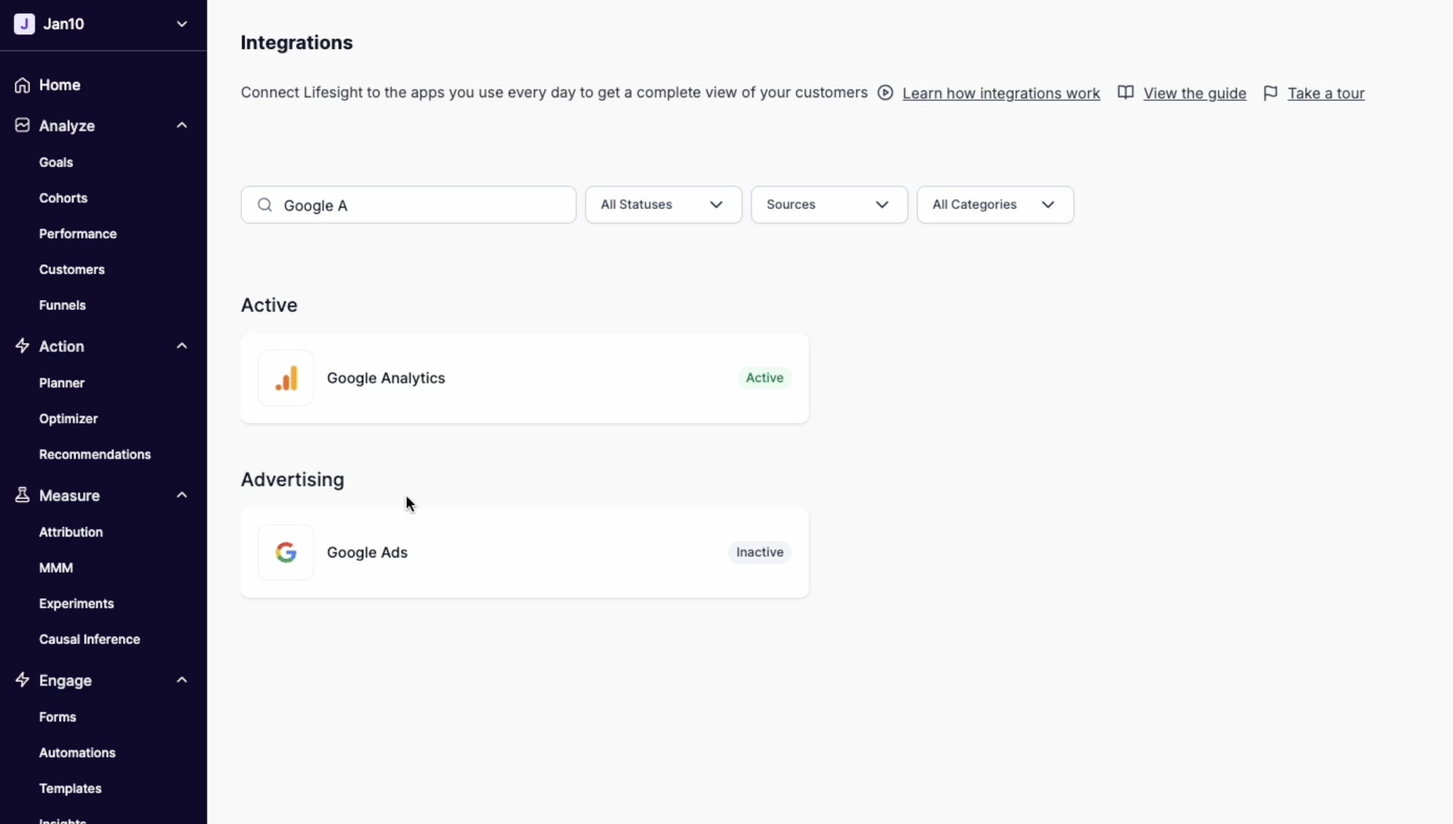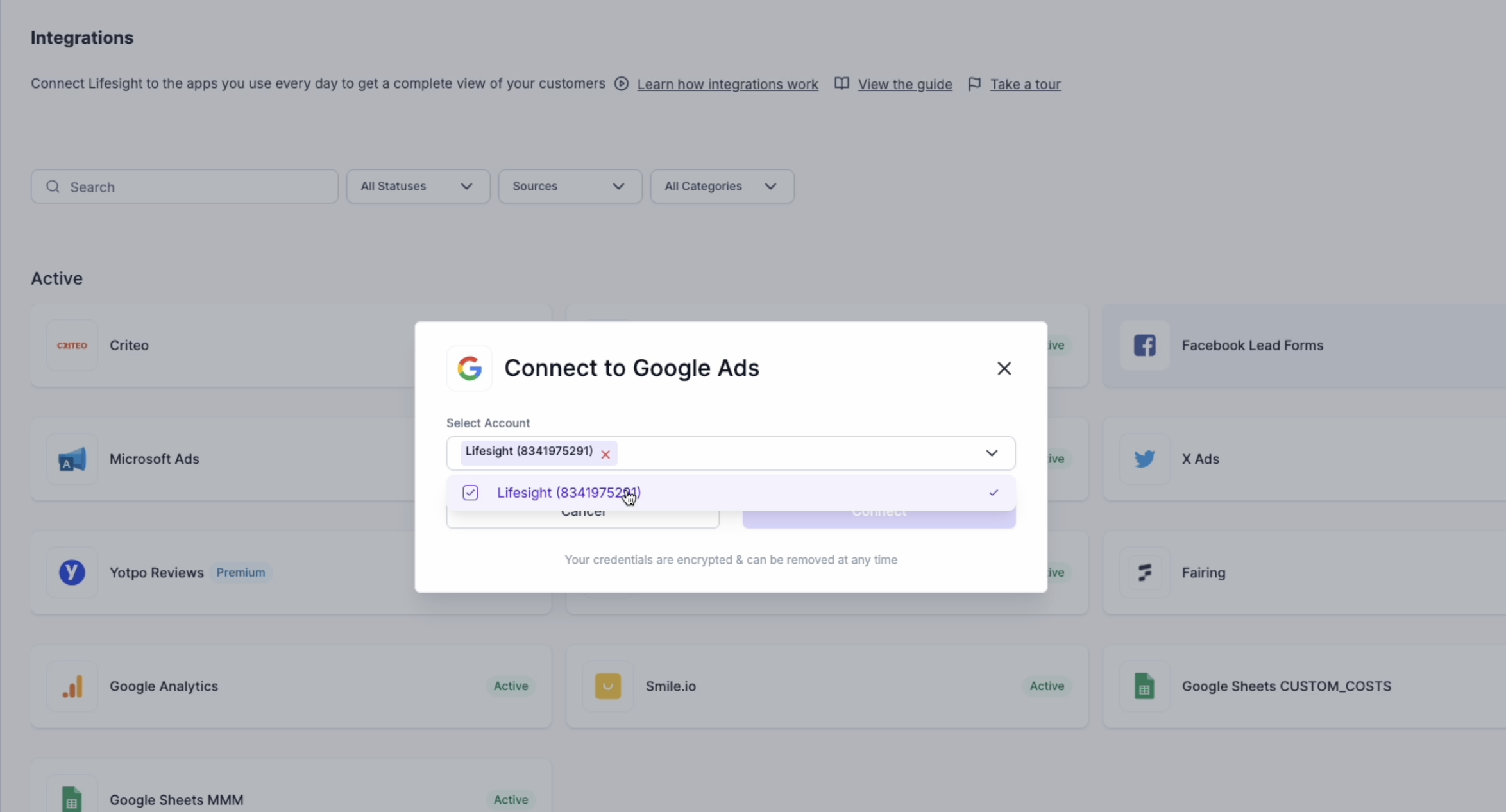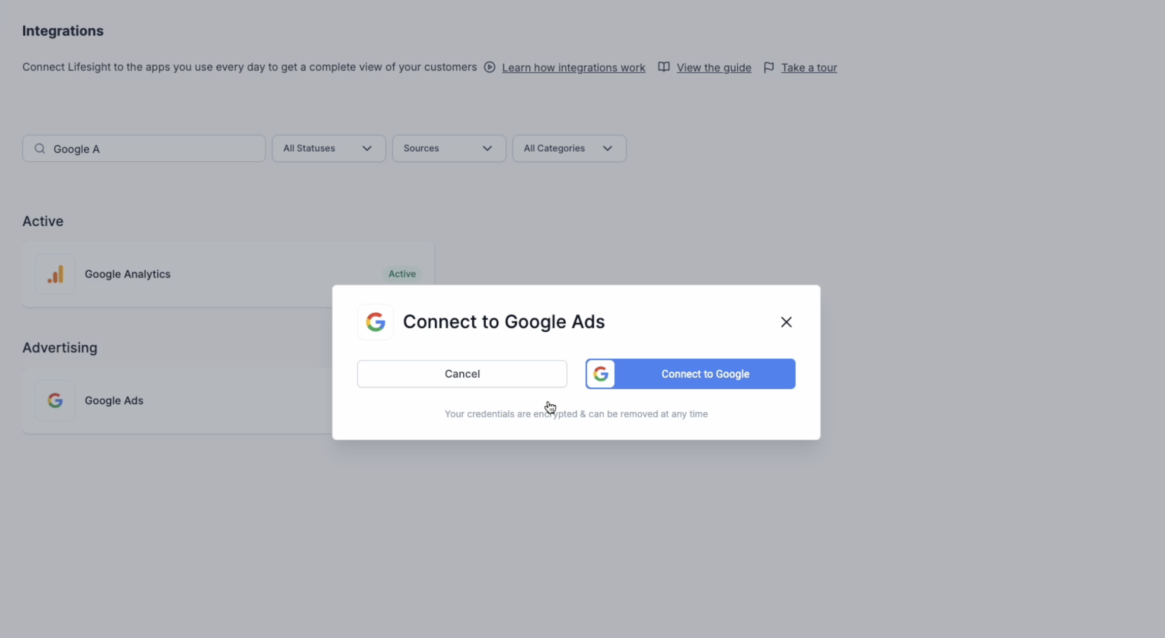 - Click on the Google Ads tile and click on the "Connect to Google" button to begin the integration process.