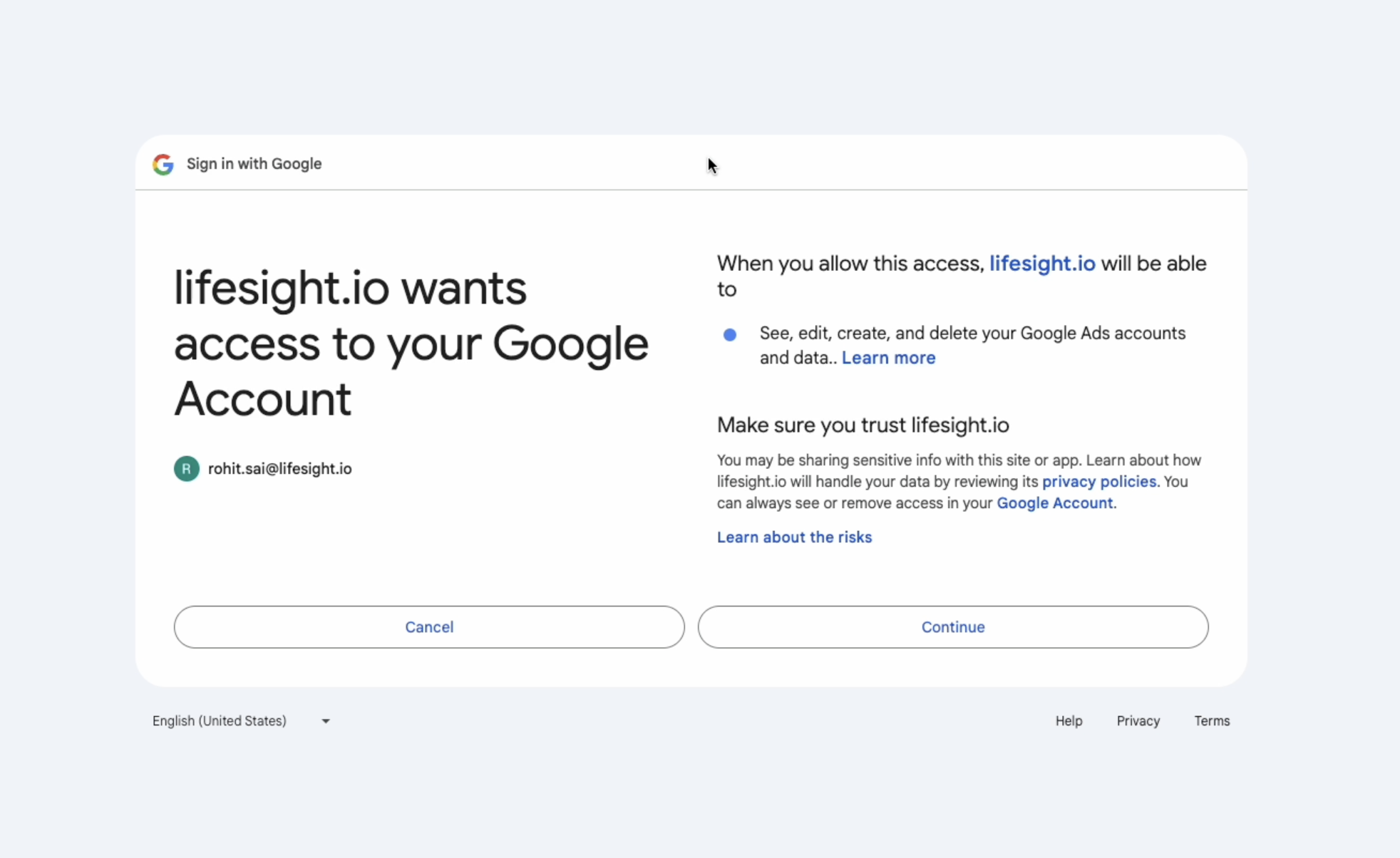 - You will be redirected to log into your Google Ads account and allow access to certain scopes.