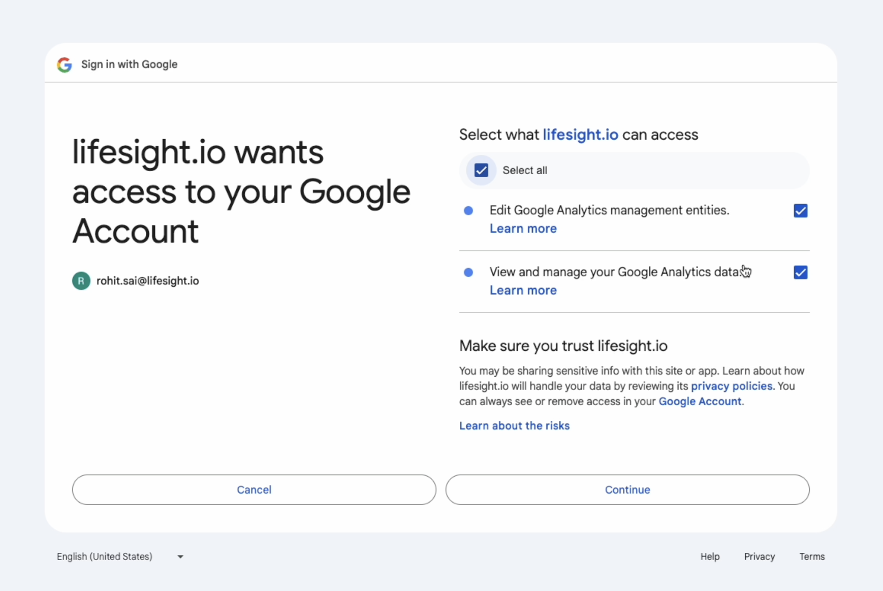 - You will be redirected to log into your Google Analytics account and allow access to certain scopes.