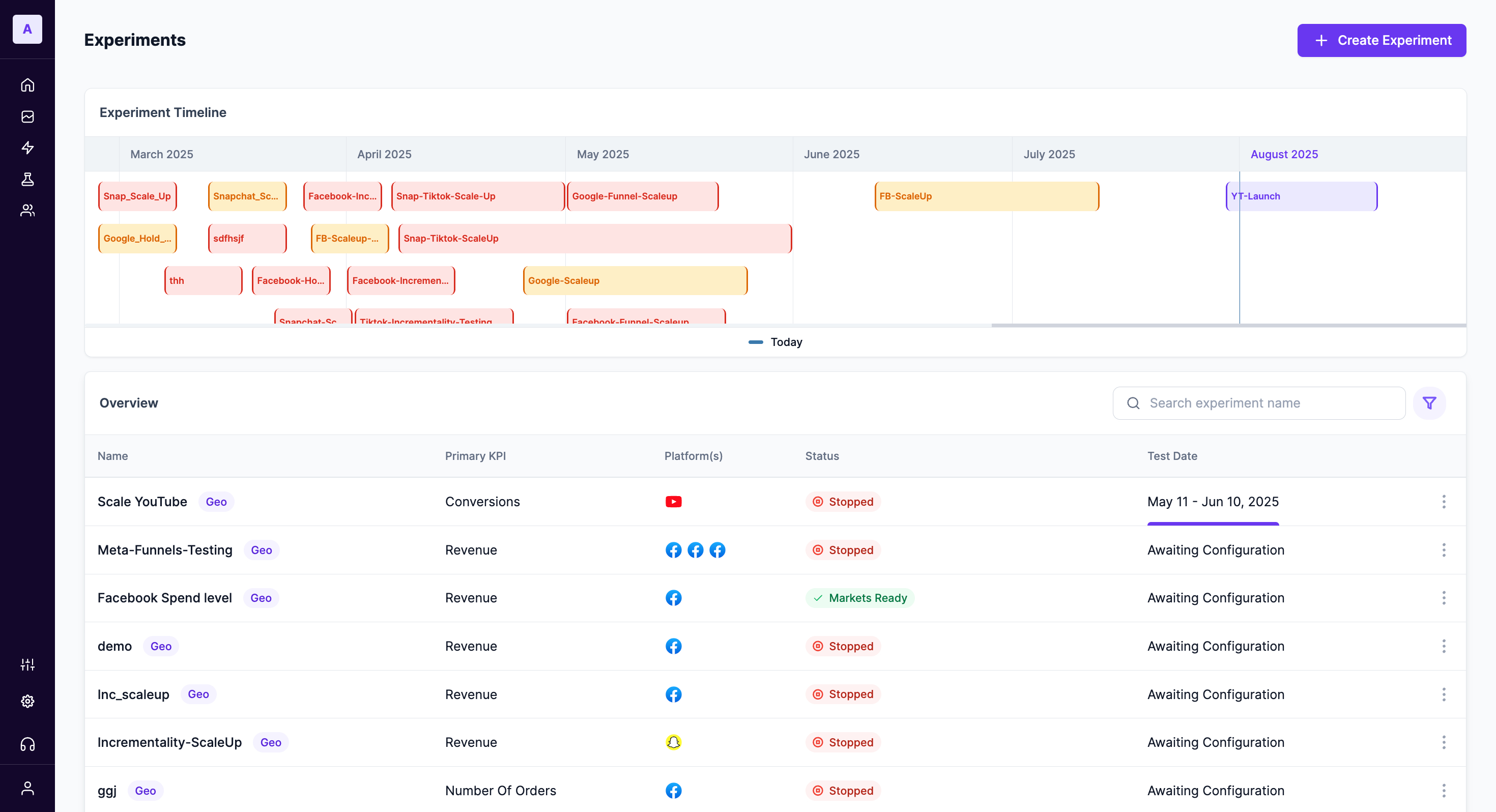 The Experiments dashboard gives you an overview of all the experiments run on Lifesight.