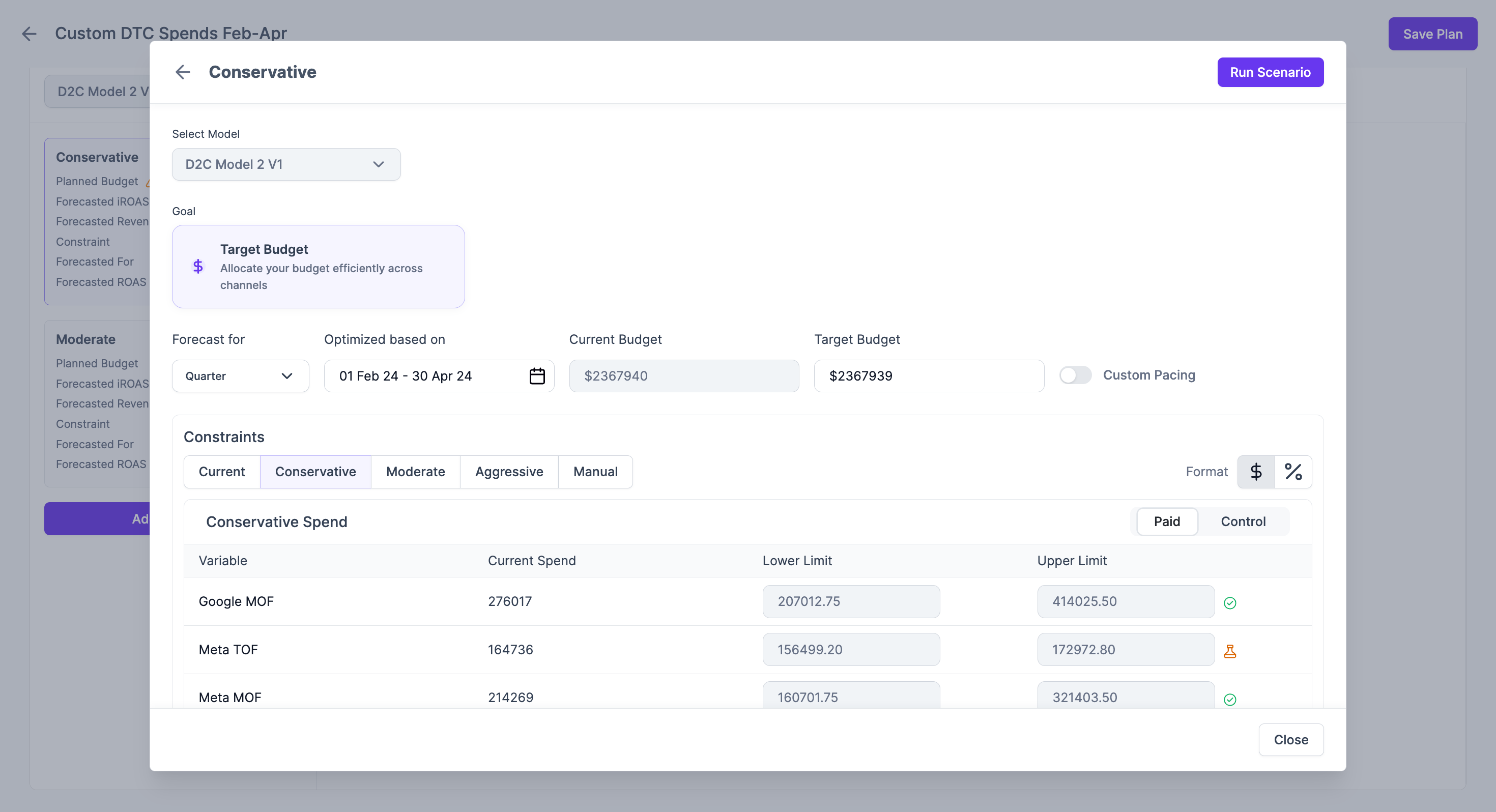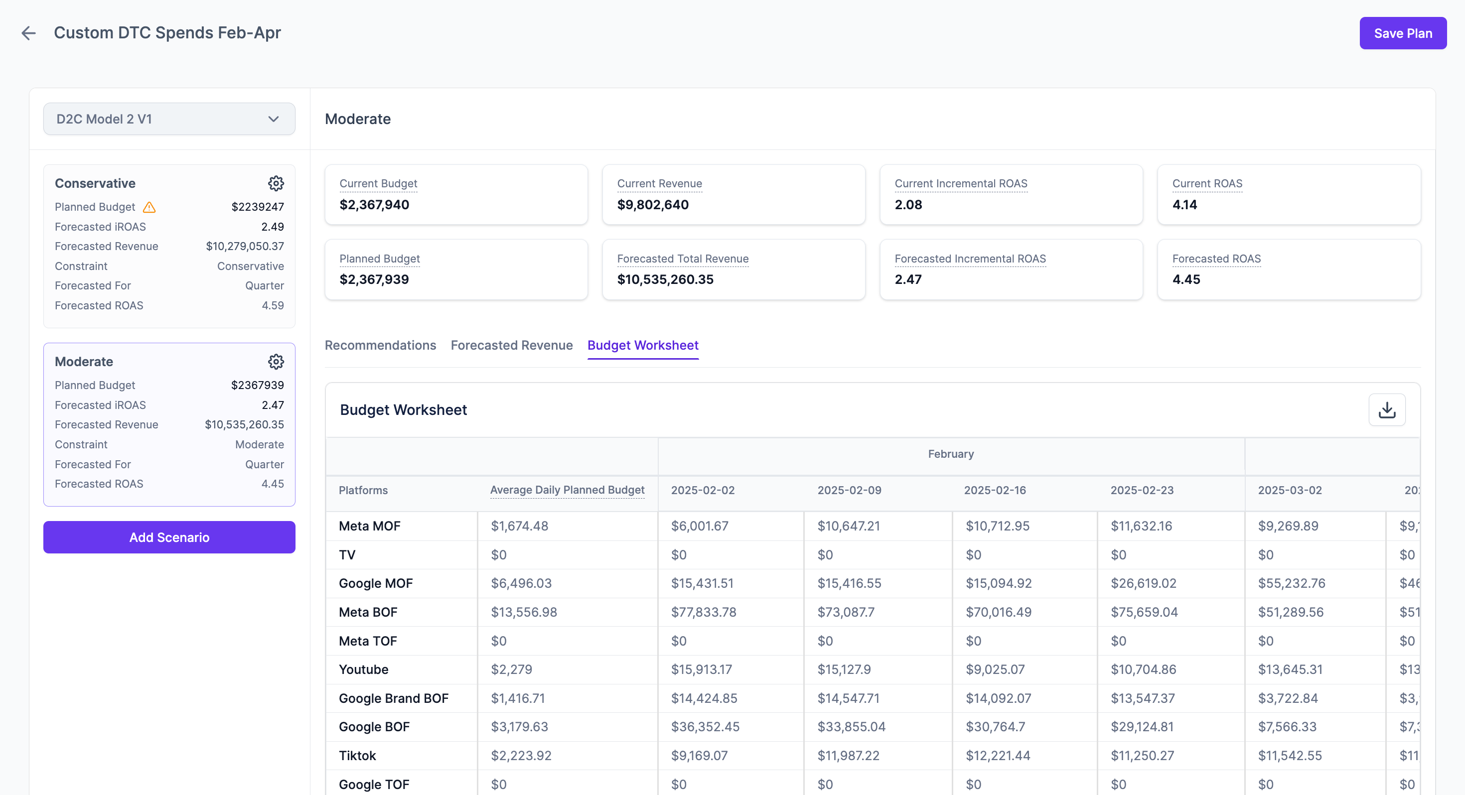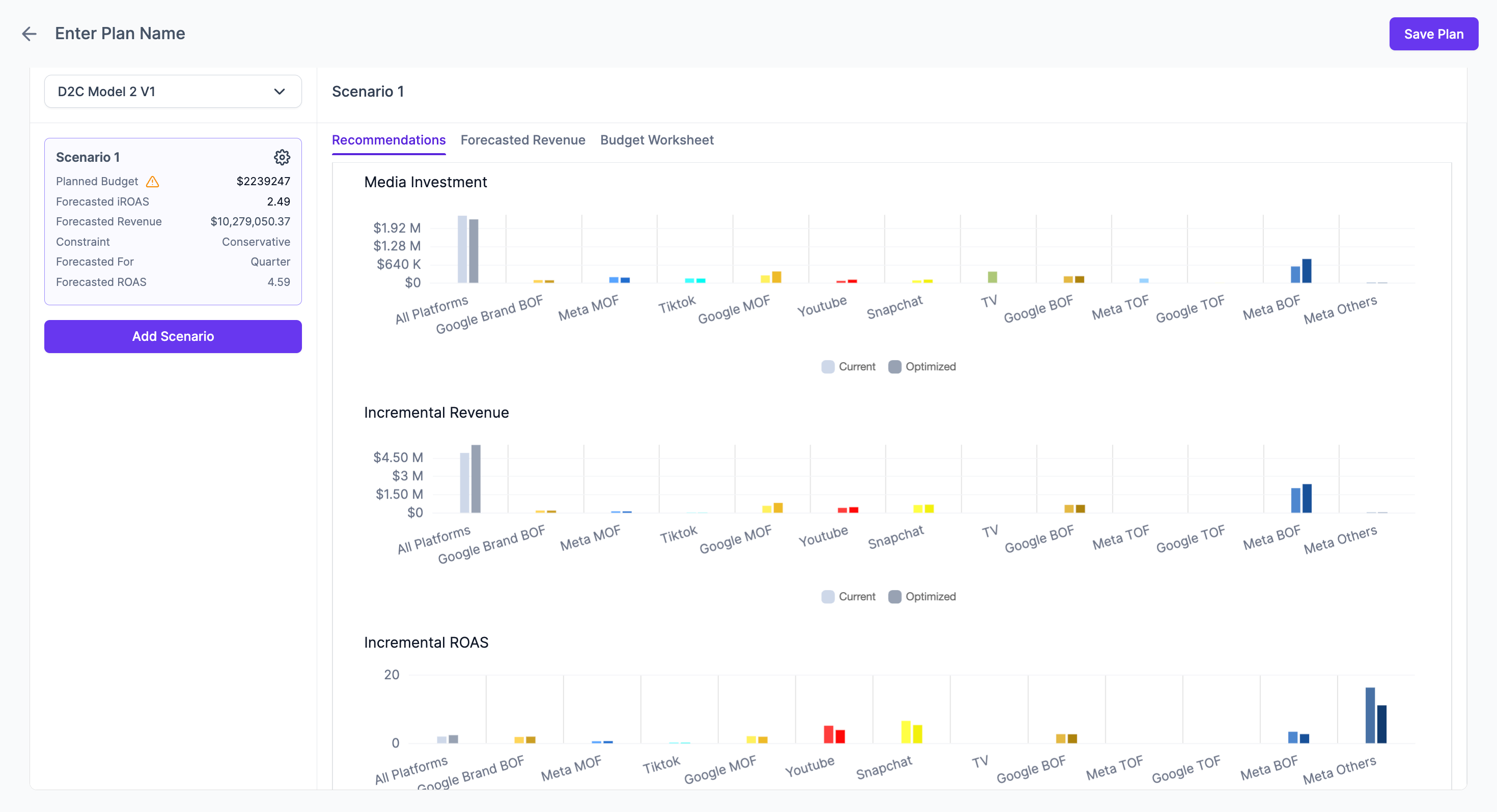 Planned Budget. - Forecasted Incremental ROAS (iROAS): The predicted incremental revenue generated only by your ad spend in this scenario.