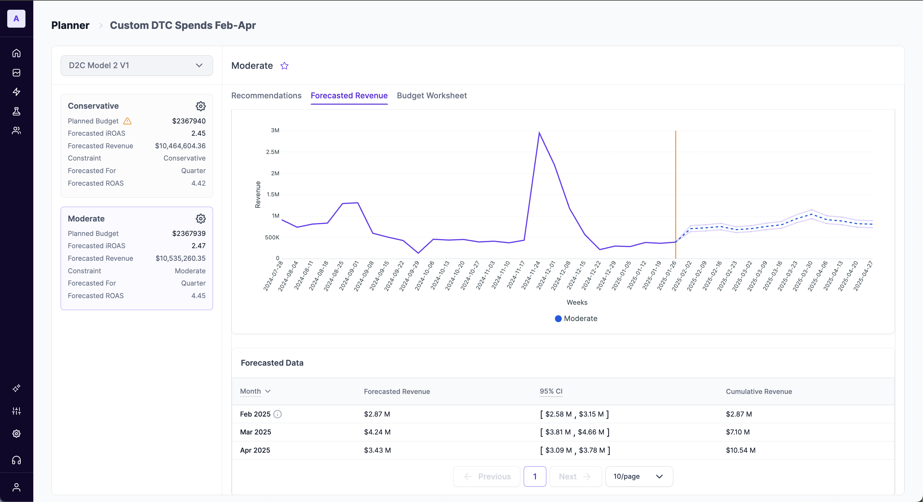 - Comparing Scenarios: Simply click on a different scenario card in the left-hand panel. All the data in the Recommendations, Forecasted Revenue, and Budget Worksheet tabs will instantly update to reflect the selected scenario, allowing for quick and easy comparison.