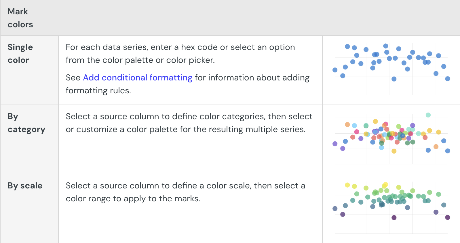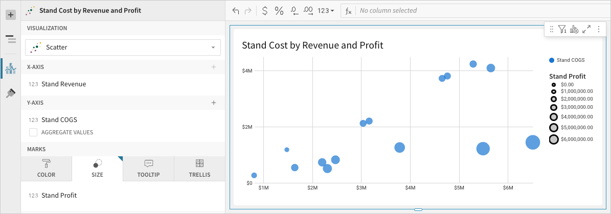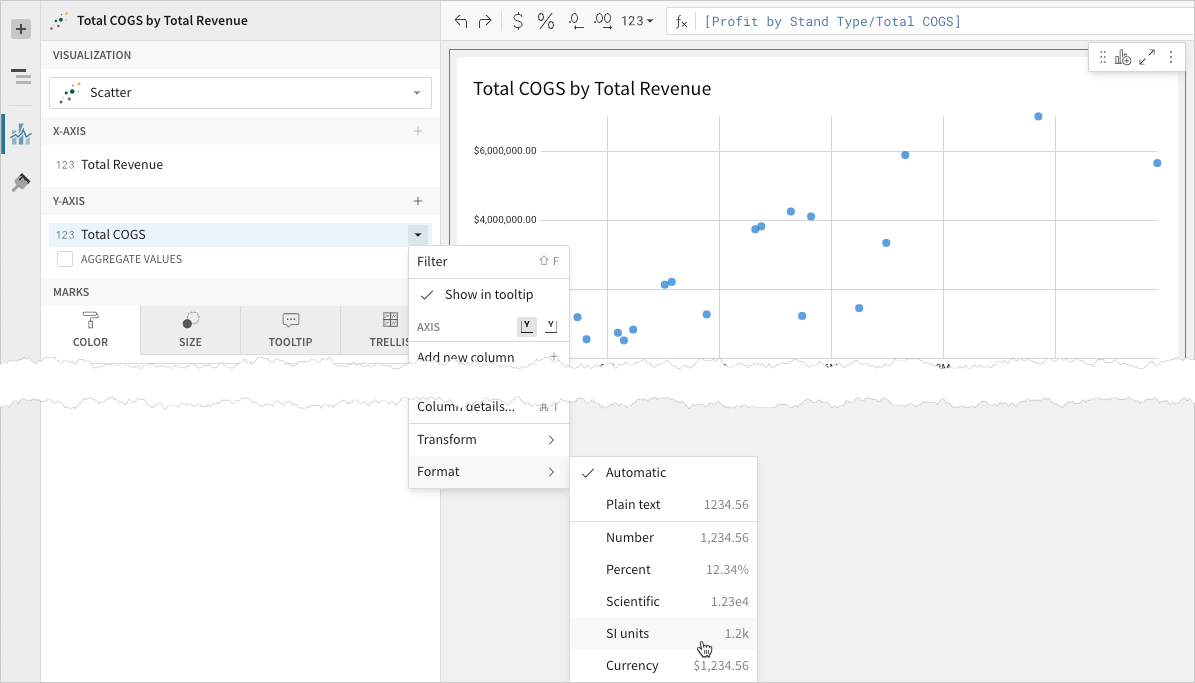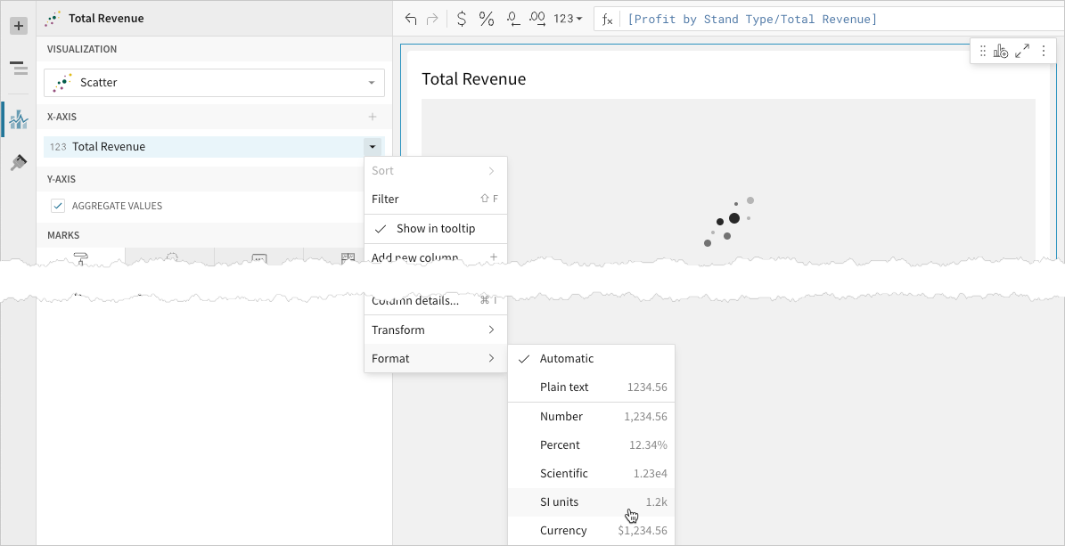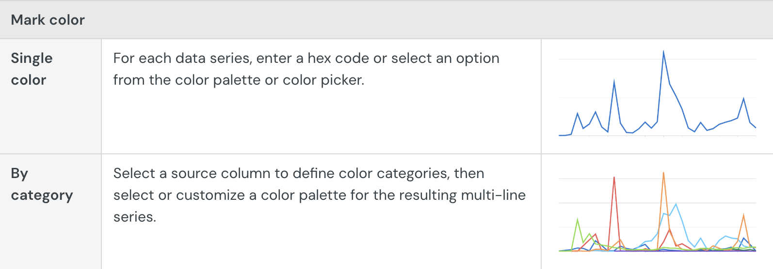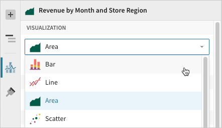 You can convert data value types, change the data aggregation or truncation, and customize chart markers and tooltips. Depending on the visualization type selected, you may also have options to change the chart orientation, modify data stacking, and add trellis rows and columns.