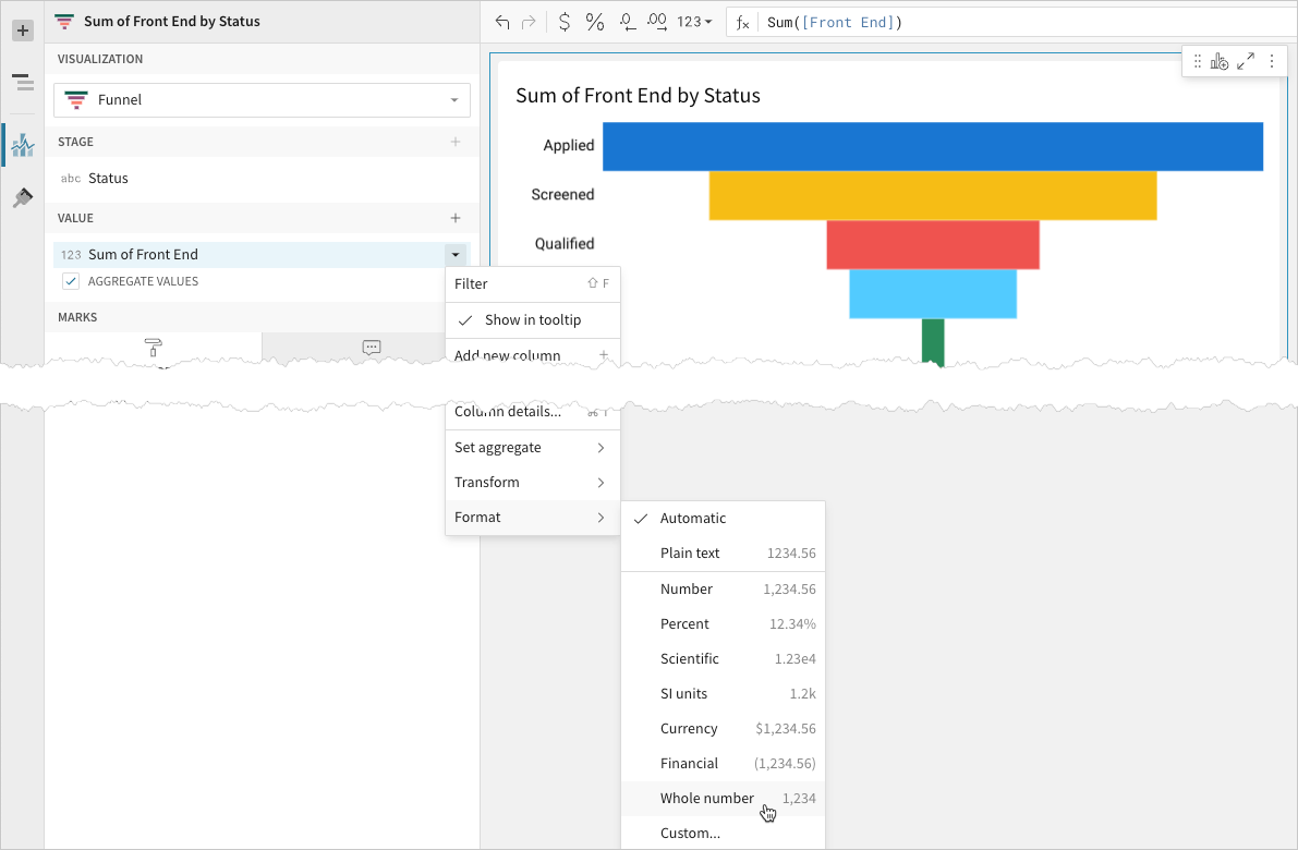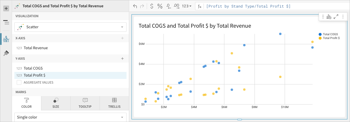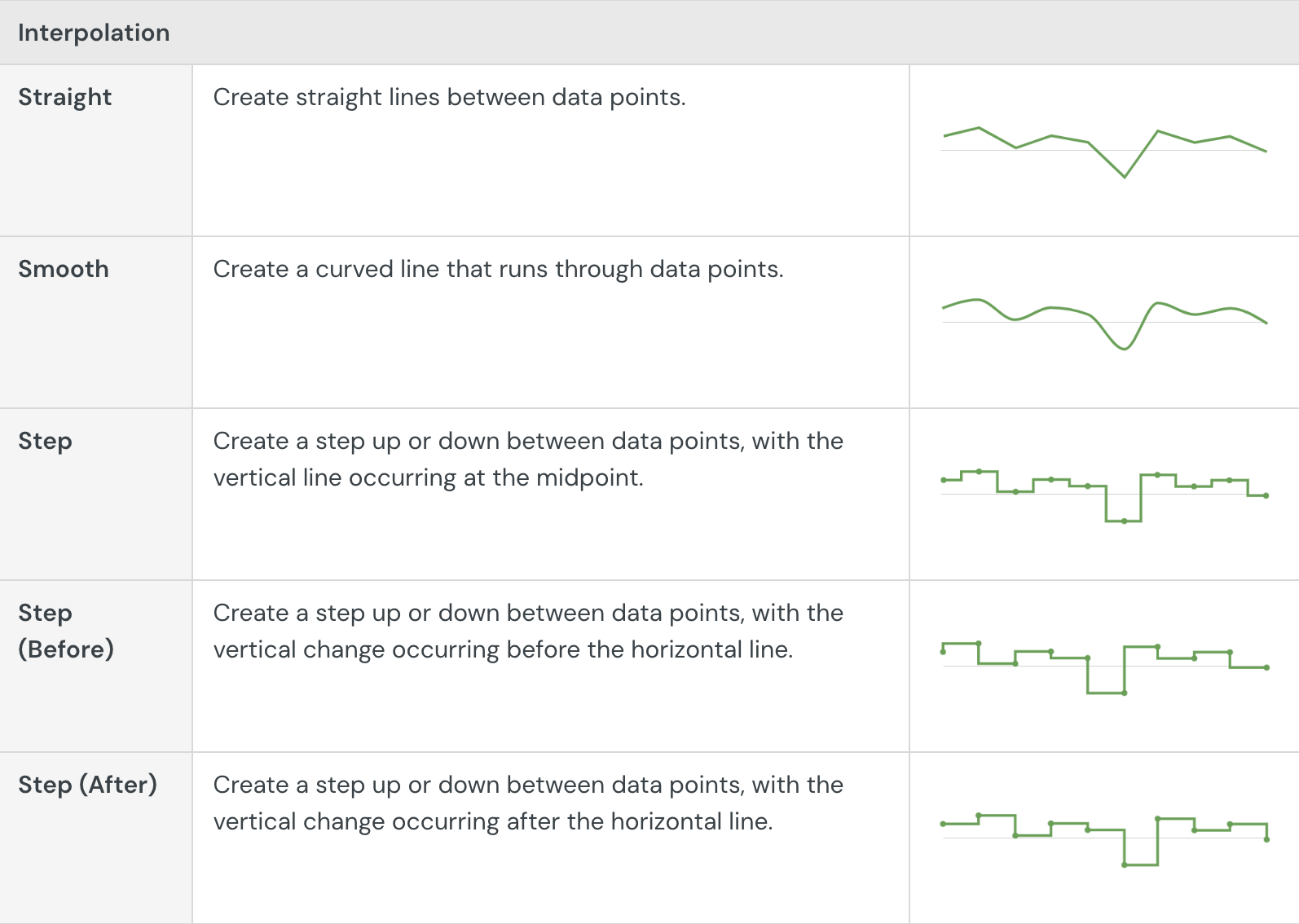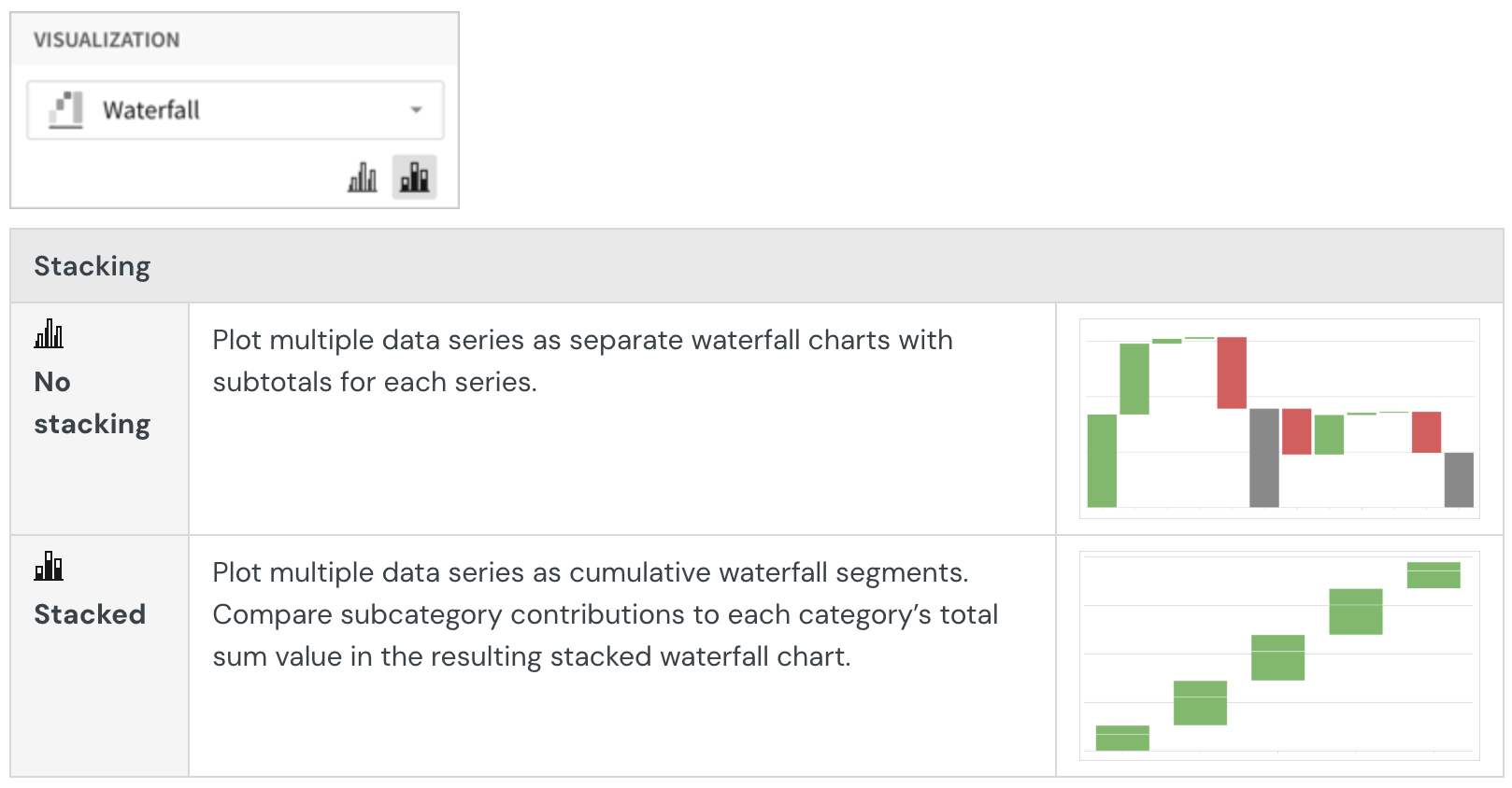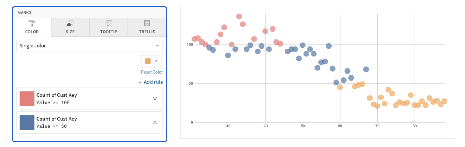 You can convert data value types, change the data aggregation or truncation, and customize chart markers and tooltips. Depending on the visualization type selected, you may also have options to change the chart orientation, modify data stacking, and add trellis rows and columns.
