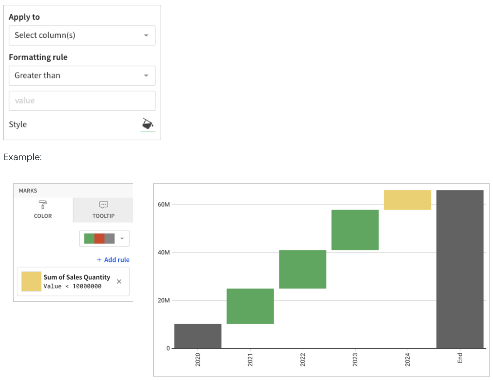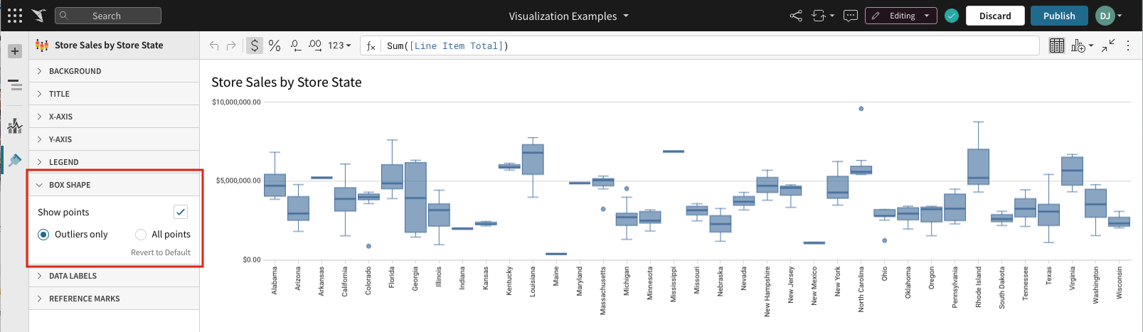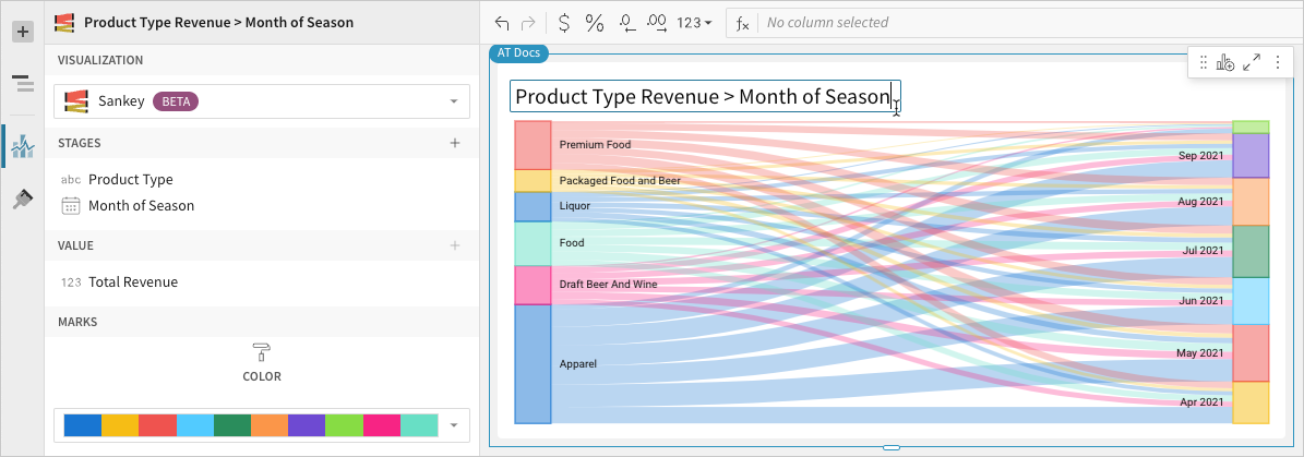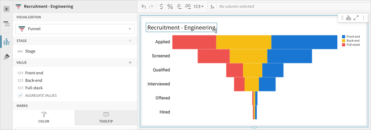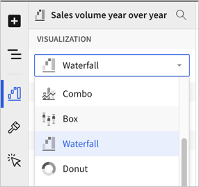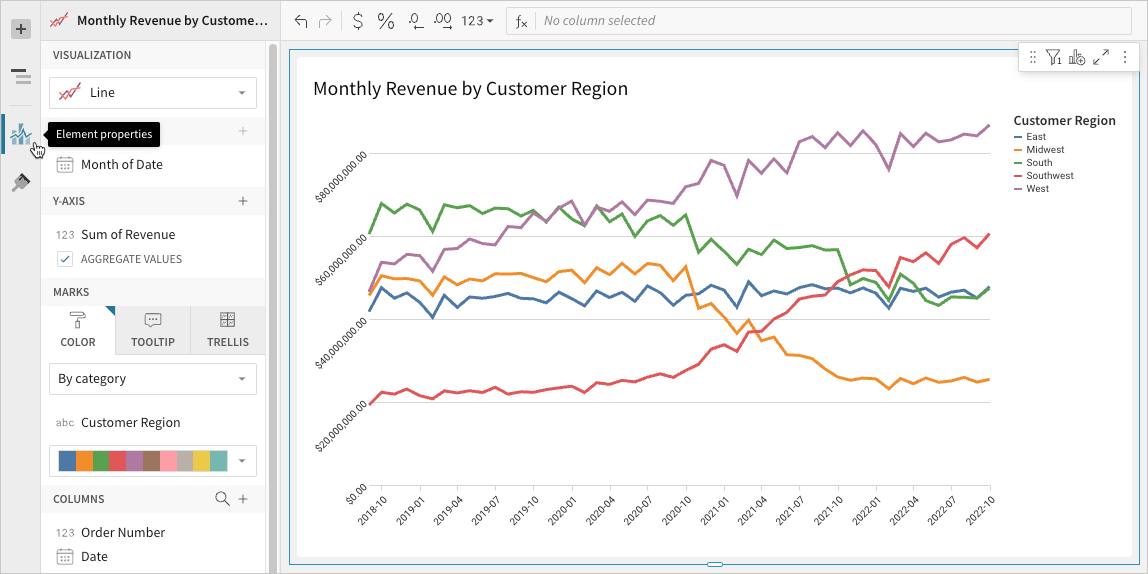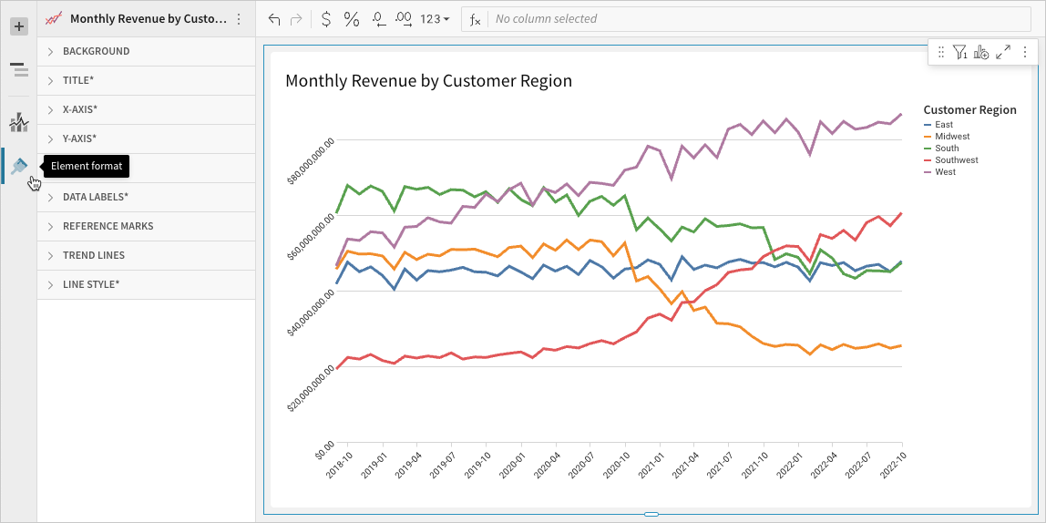 The Element format panel allows you to customize the appearance of various components, including the visualization title’s content, size, and alignment. Depending on the visualization type selected, you may also be able to format the background, axes, legend, data labels, reference marks, trend lines, and more.