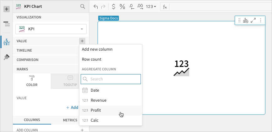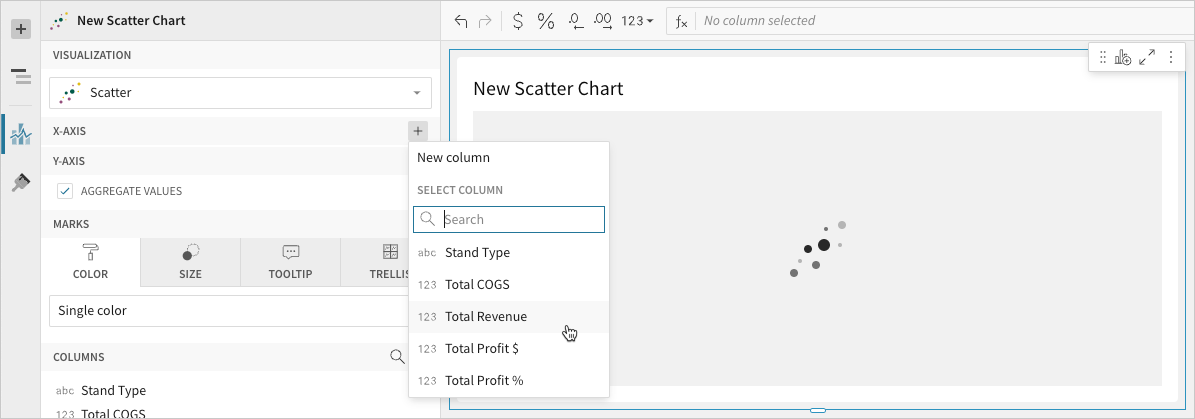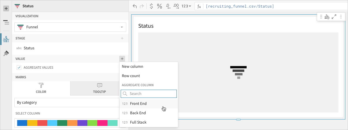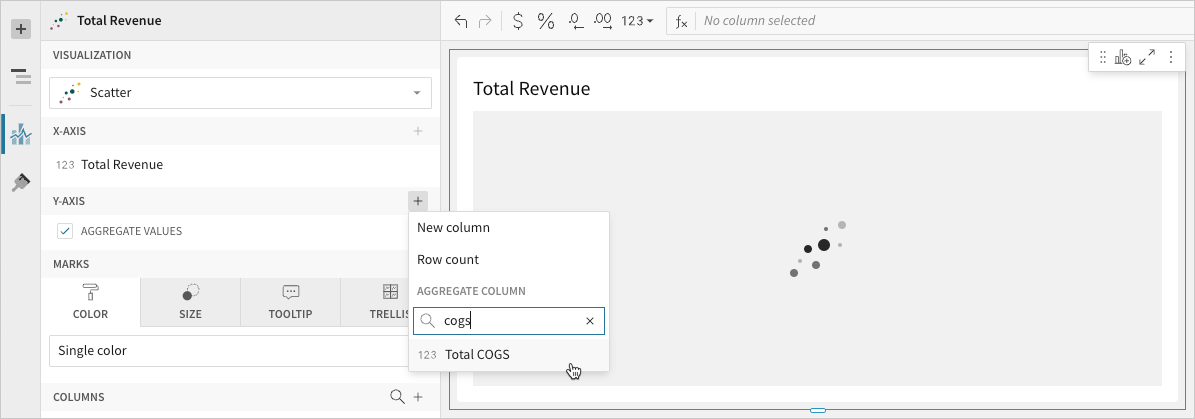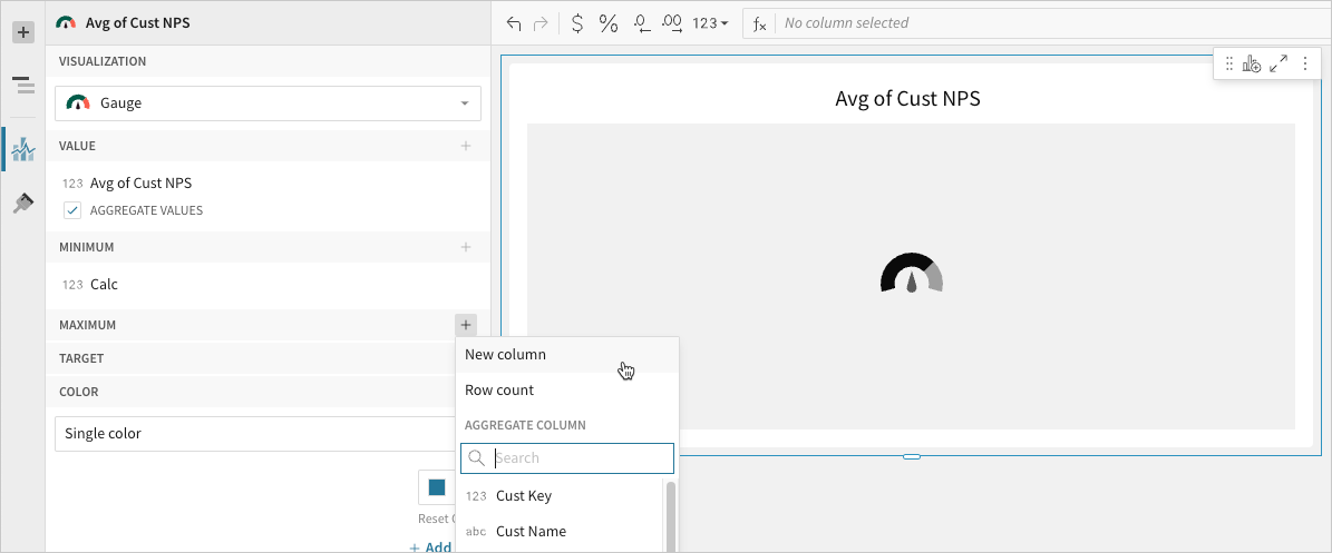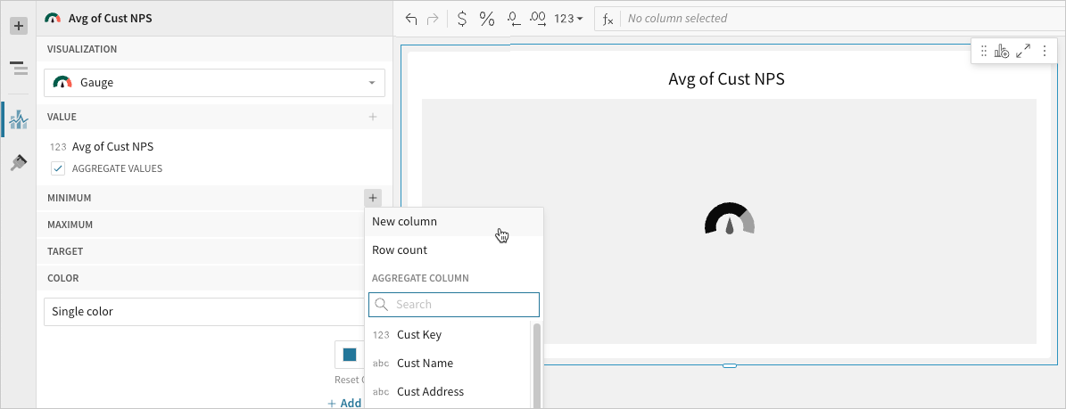 - To aggregate values of an existing column, search or scroll the Aggregate column list and select the preferred column name.