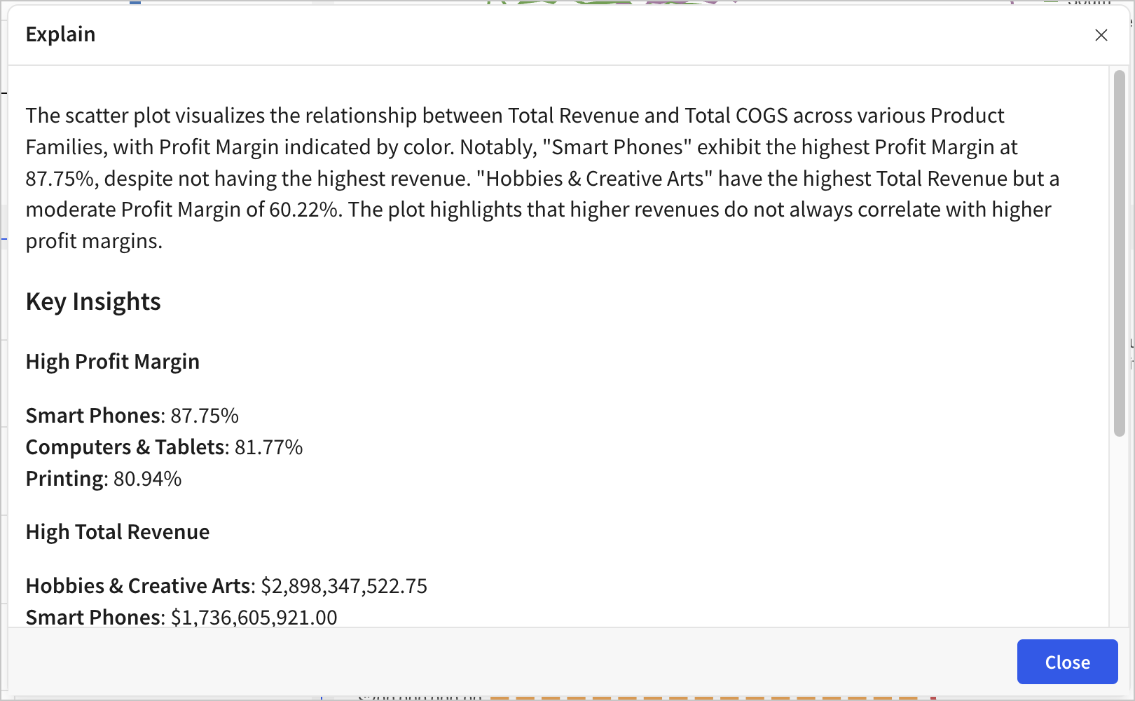 The Explain visualization feature uses AI to instantly generate a description of any chart. Details can include key insights, observations, data distribution summaries, and other context that can enhance your understanding of visualized data and help drive informed decisions.