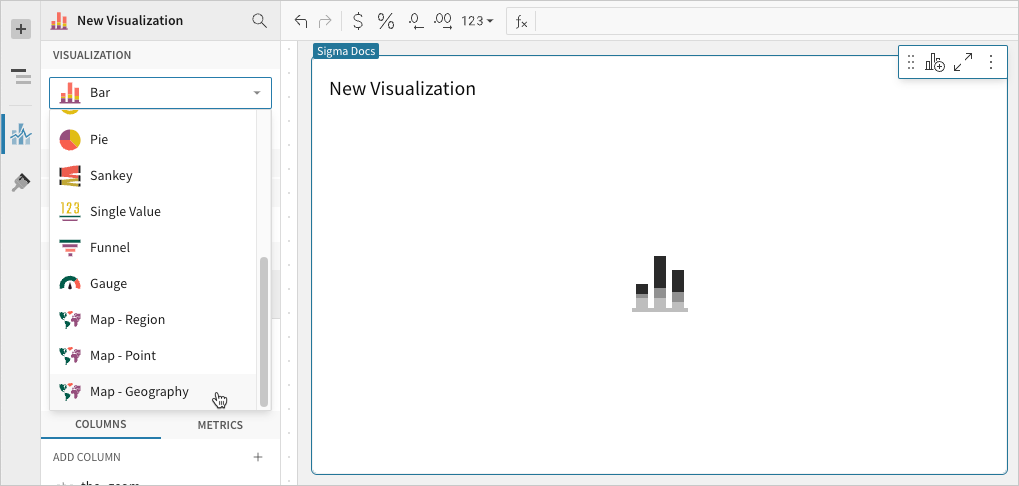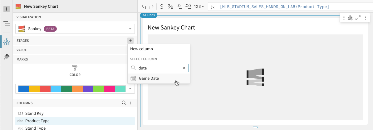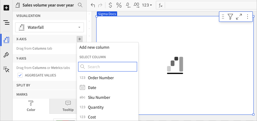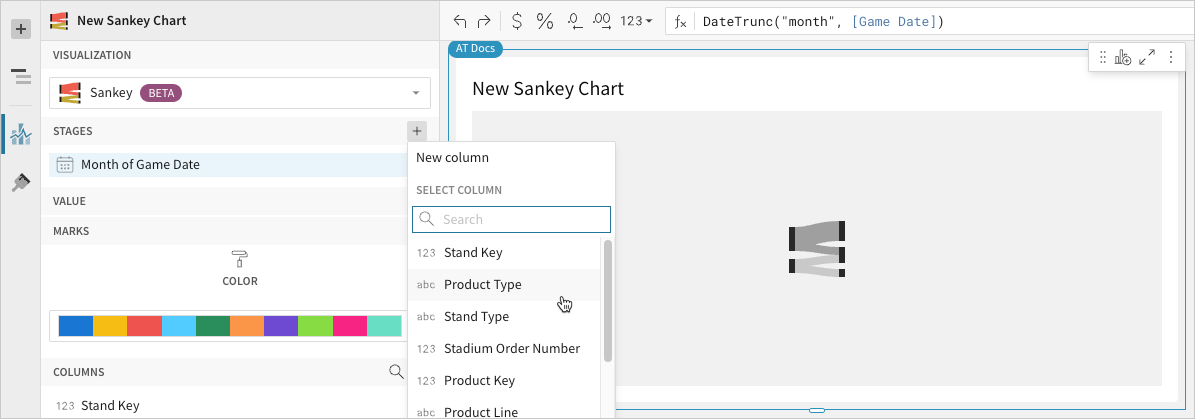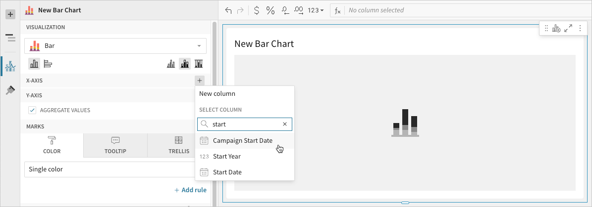 - To generate categories based on a custom formula, select New column and enter the formula in the toolbar. For example, when building a histogram, create a custom formula using the BinRange or BinFixed function to generate categories based on value ranges.