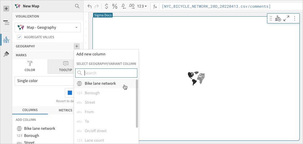 Lifesight's Map - Geography visualization requires a geography or variant data column on the map's Geography field. If your WKT or GeoJSON data is stored as a text column (abc), you can convert it using the Geography or Variant function.