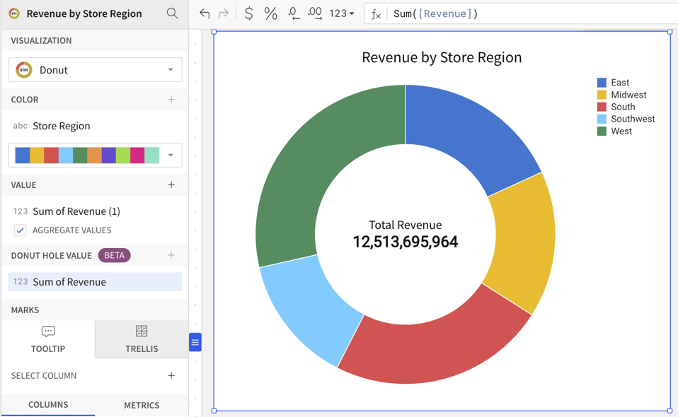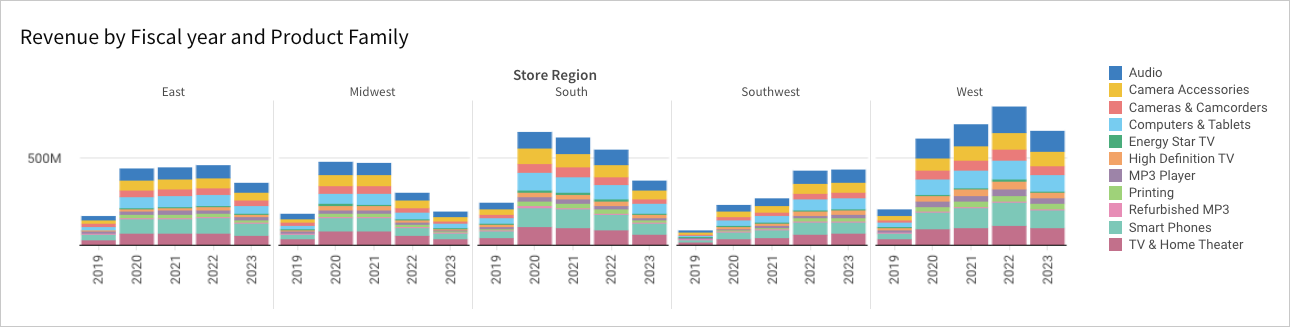 Trellis columns: This second chart incorporates trellis columns to deepen the analysis. You can still analyze total revenue by fiscal year and product family, but the additional dimension allows you to compare these data points within and across smaller data subsets based on store region.