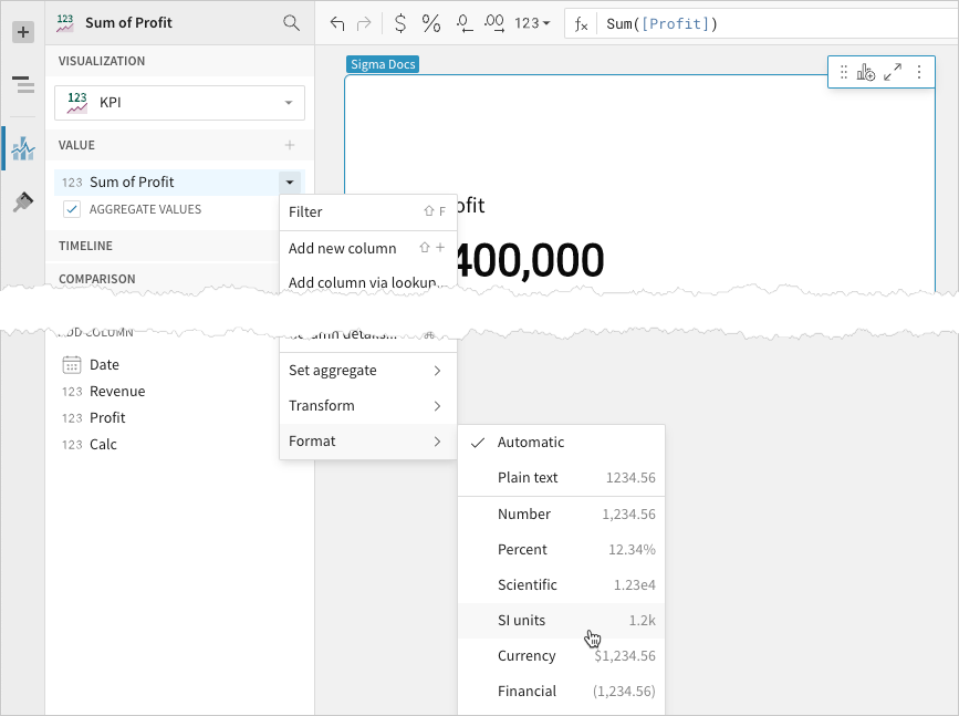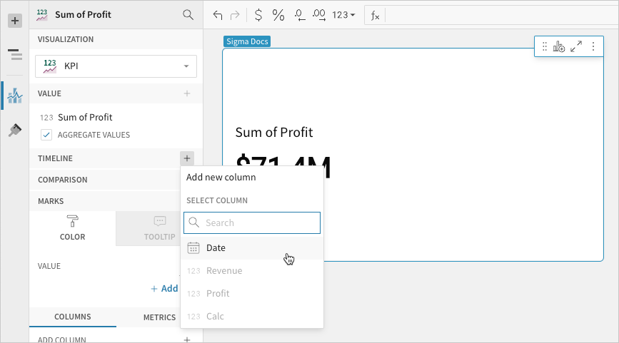 - To calculate values based on a custom formula, select New column and enter the formula in the toolbar.