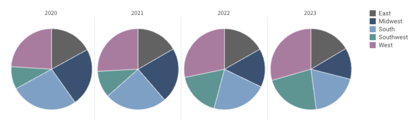 Trellis charts (also known as small multiples or panel charts) allow you to compare and analyze multiple subsets of data within a single visualization element. The subsets are represented by smaller charts (or panels) arranged in rows and columns based on specific data dimensions. The division of data and resulting grid-like structure make it easier to identify patterns, trends, and relationships that can help you uncover valuable insights within large, complex datasets.