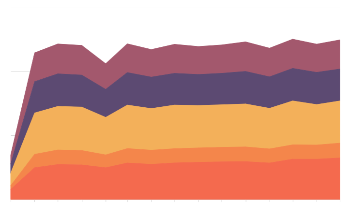 Illustrate the magnitude or cumulative values of one or more metrics over time. Compare categories or groups of data, or evaluate the data composition or part-to-whole relationship.