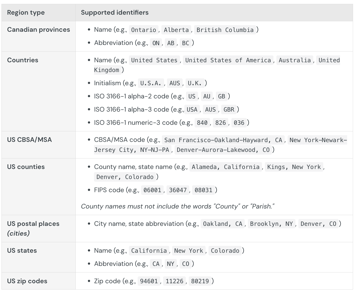 Region values are not case sensitive. For example, the value for the state of California can be California, california, CA, Ca, or ca. However, all values in the column should use the same supported identifier and capitalization for data consistency.