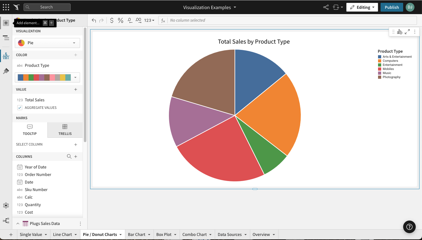 Visualizations are graphical data elements that add visual context to your analysis. They allow you to create, explore, and view your data in a more focused and digestible format.
