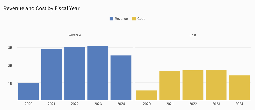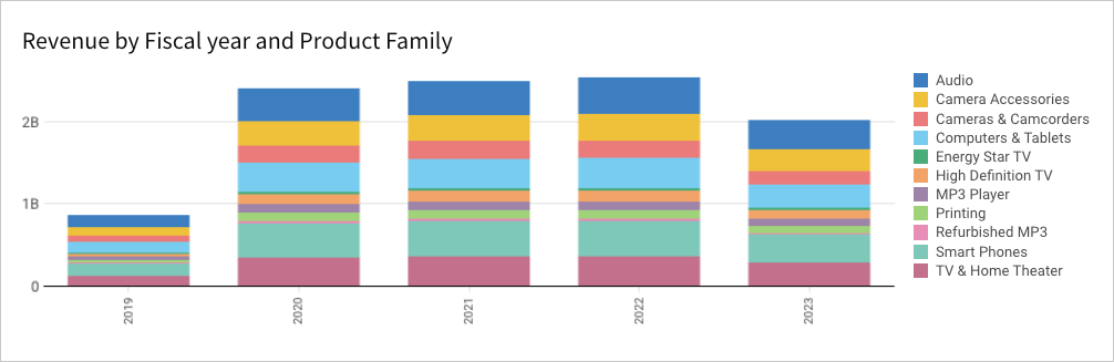 No trellising: This initial chart shows a basic view that compares total revenue per fiscal year from 2019 to 2023. The stacked bars differentiate revenue for each product family, providing an additional dimension to explore within and across each year.