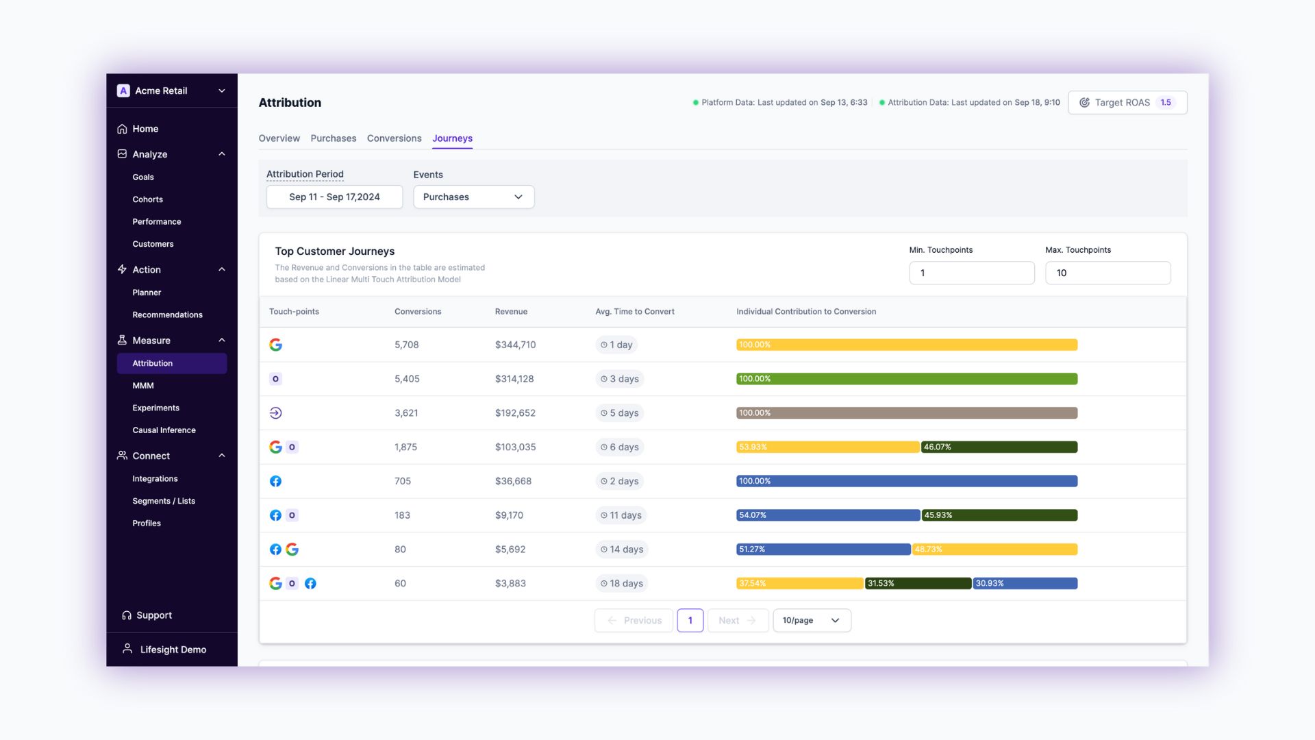 Once you have successfully integrated your website/store and your ad channels, you will have access to the Customer Journey report to analyze your attribution data from end to end. (Lifesight will track conversions post UTM configuration)