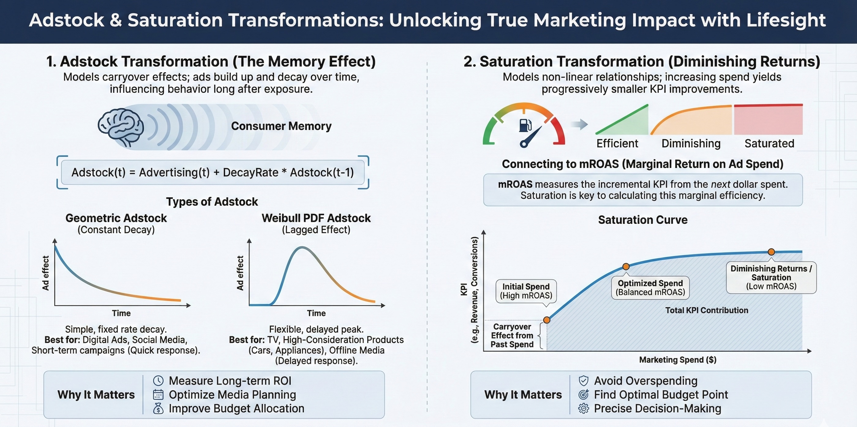 For further information on adstock transformation, saturation curves, or budget optimization techniques, refer to the related methodology articles available in the Lifesight documentation.