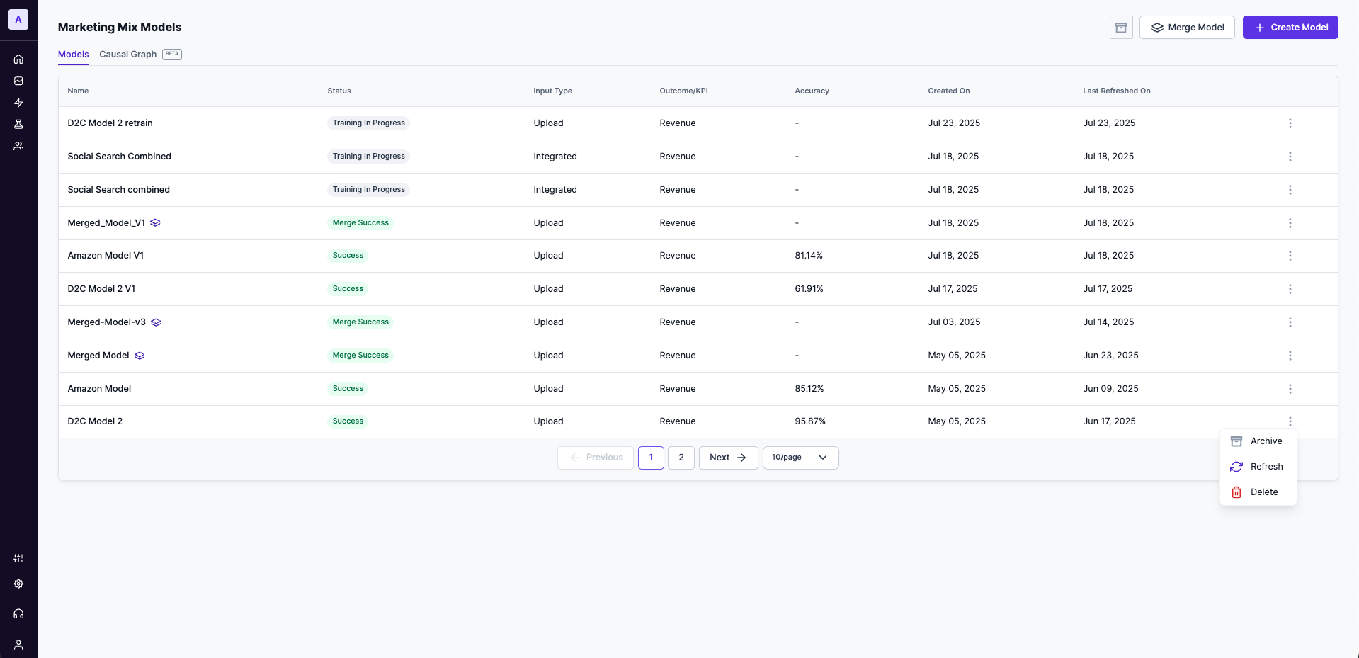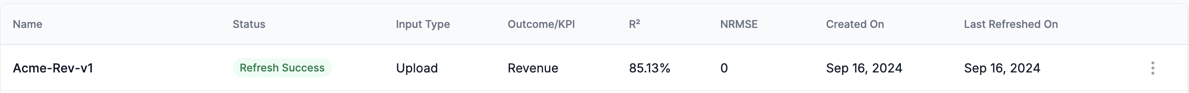Refreshbutton next to the relevant model on the Marketing Mix Models page. - Upload a CSV file with refreshed data that matches the column structure of the original file and contains additional rows.