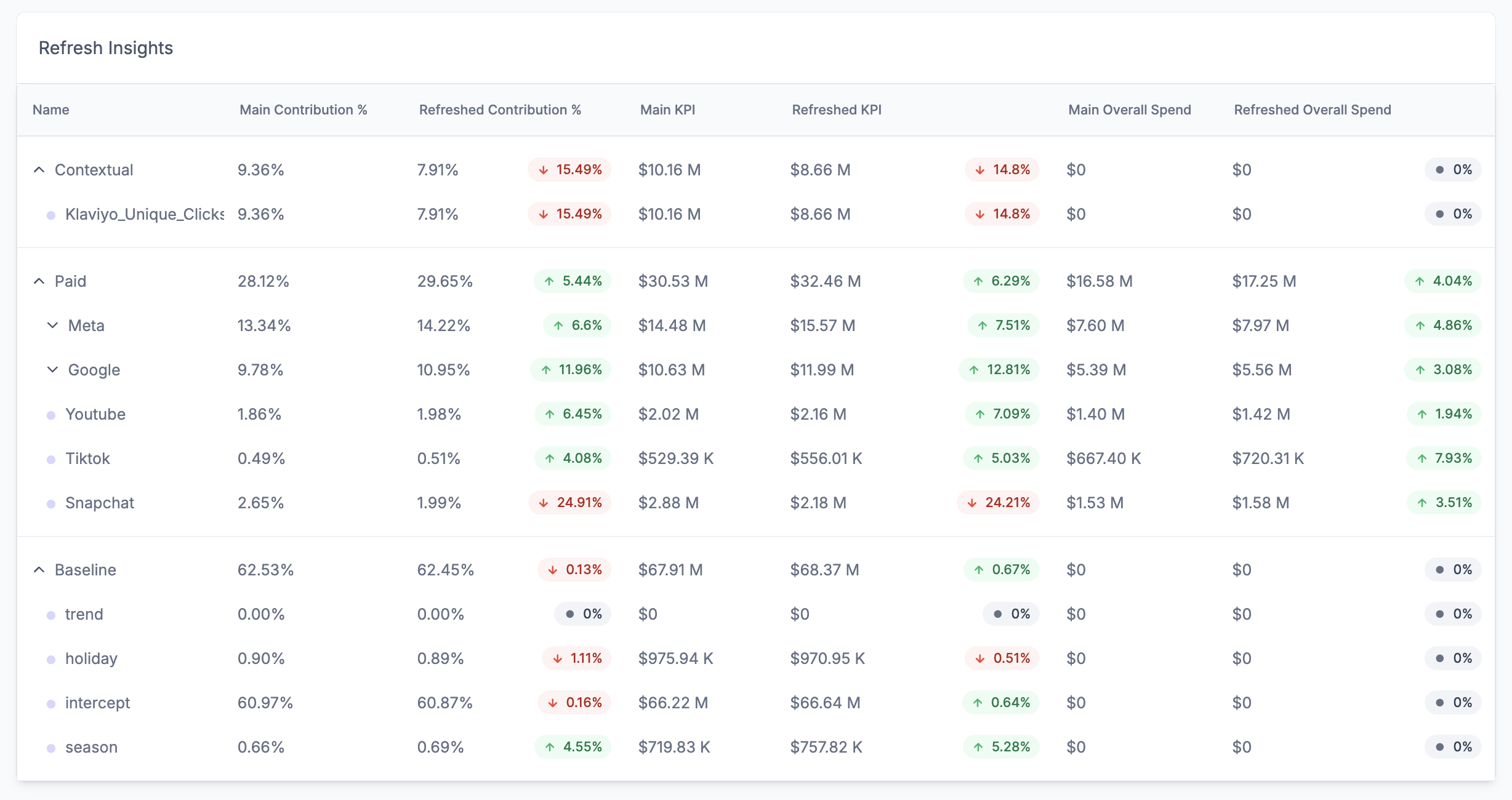 The Refresh insights table shows the latest model refresh insights vs the selected previously selected model insights for every channel and category. Seamlessly view the following metrics: