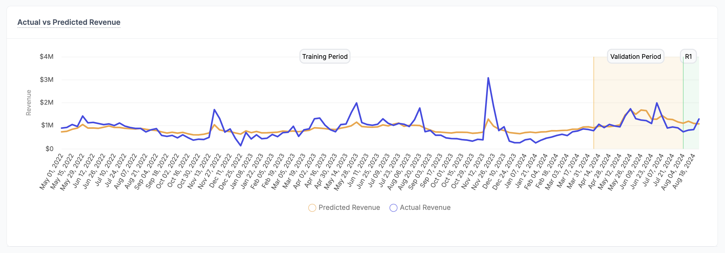 The Validation period is different and set for backtesting purposes. This can be modified by mentioning the Training Size in the Configuration tab while creating an MMM model.