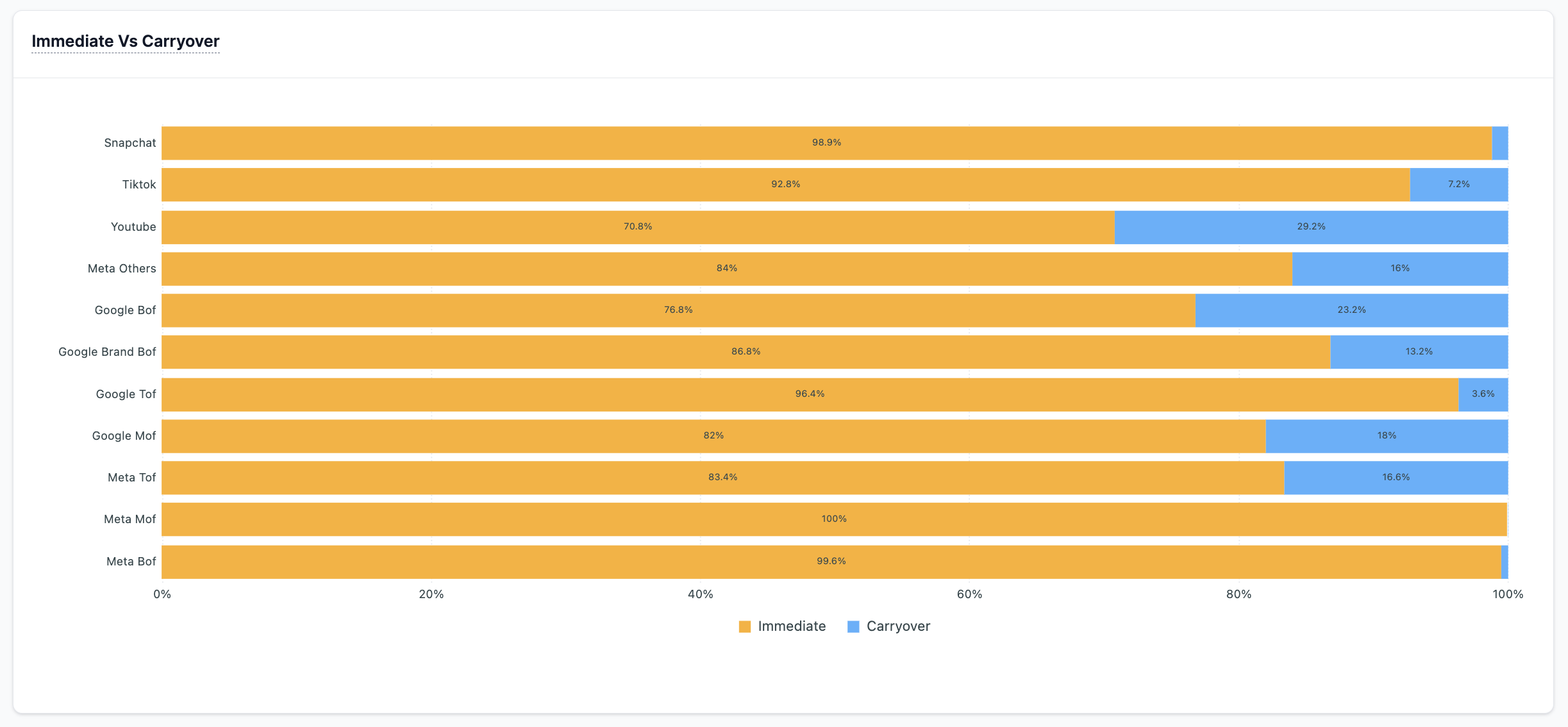 This chart breaks down the impact of media spending on revenue into two distinct categories: Immediate and carryover contributions. It allows you to discern when the majority of a campaign's effects are realized.