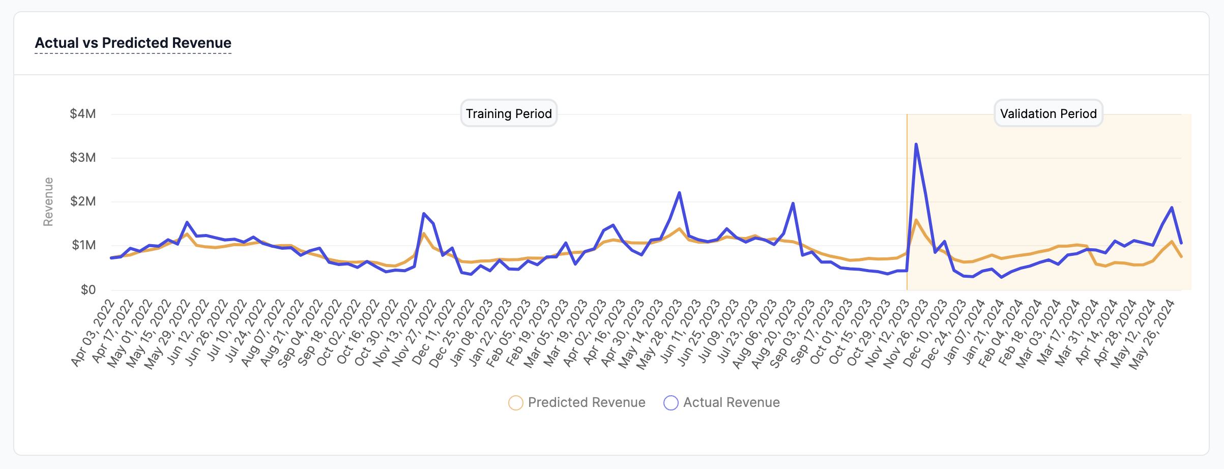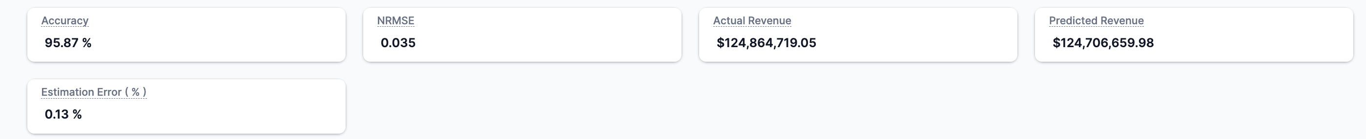 The Normalized Root Mean Square Error, also referred to as the prediction error, indicates the accuracy of the model’s predictions. Lower values represent more accurate predictions. It measures the square root of the average squared differences between predicted and actual outcomes. - Actual Revenue: