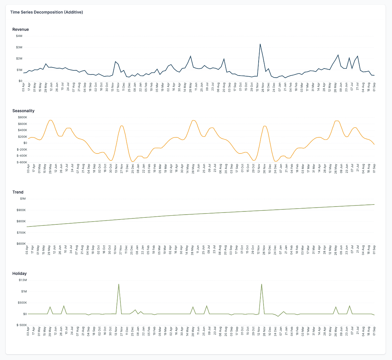 Time series data includes components like seasonality, trends, and holidays that impact conversions. This breakdown helps marketers understand how these factors influence MMM results before modeling. You can view these components and choose whether to include them in future models. Additionally, it aids in setting the base period when using the Planner for forecasting.