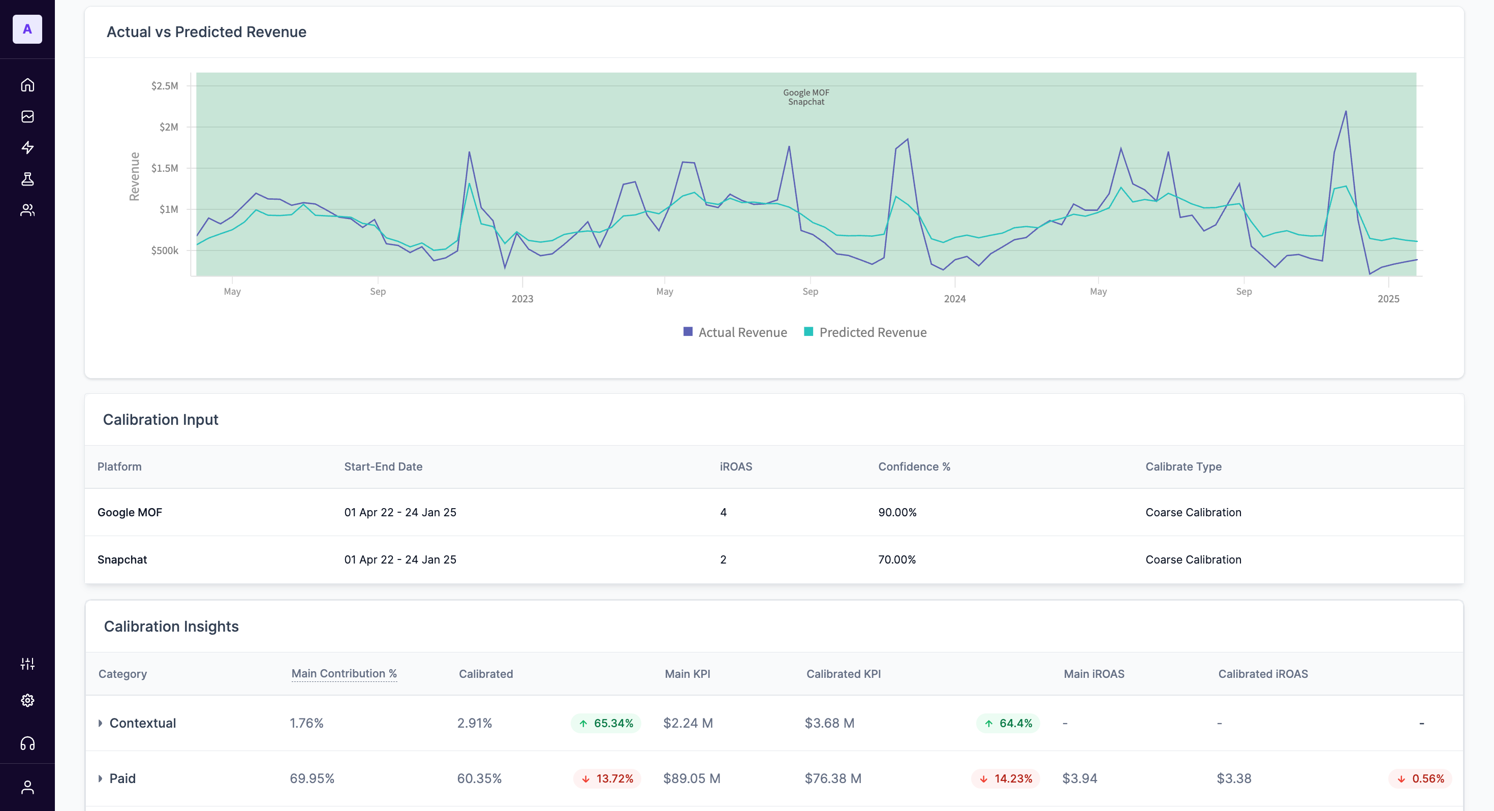 This chart visually compares the "Actual Revenue" against the "Predicted Revenue" over time, allowing you to see the model's accuracy after calibration.
