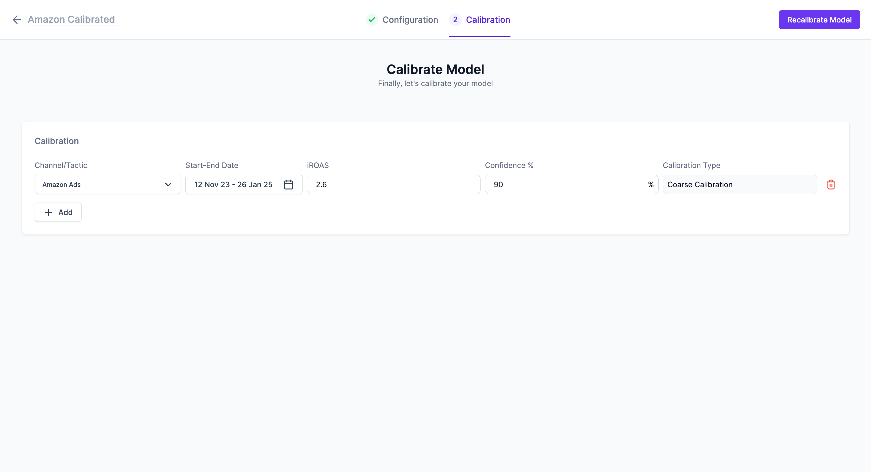 Channel/Tactic: Select the specific marketing channel or tactic (e.g., Amazon Ads, Google MOF, Snapchat). Start-End Date: Define the date range for the calibration data (e.g., {{CALIBRATION_START_DATE}} - {{CALIBRATION_END_DATE}}). ROAS: Enter the Return on Ad Spend (ROAS) value for the chosen channel/tactic (e.g., 2.6). Confidence %: Set the confidence level for this calibration point (e.g., 90%). Calibration Type: Select the type of calibration (e.g., Coarse Calibration). - Recalibrate the Model: After inputting all desired calibration parameters, click the Recalibrate Model button to apply the changes and update your model.