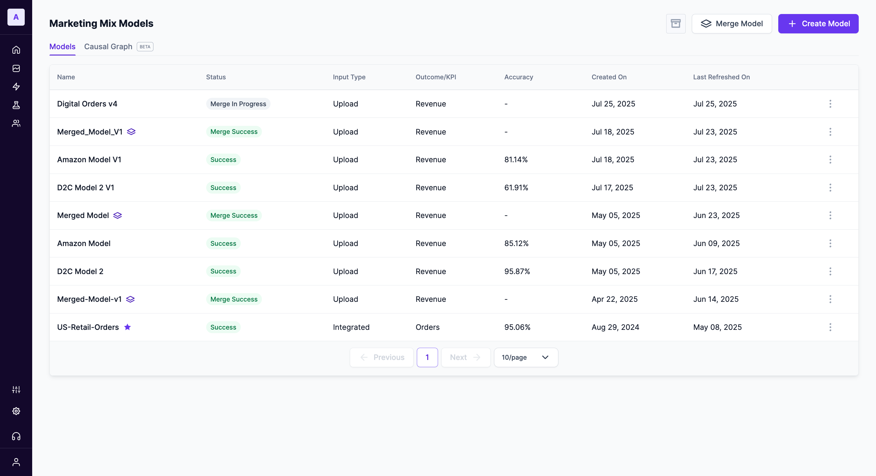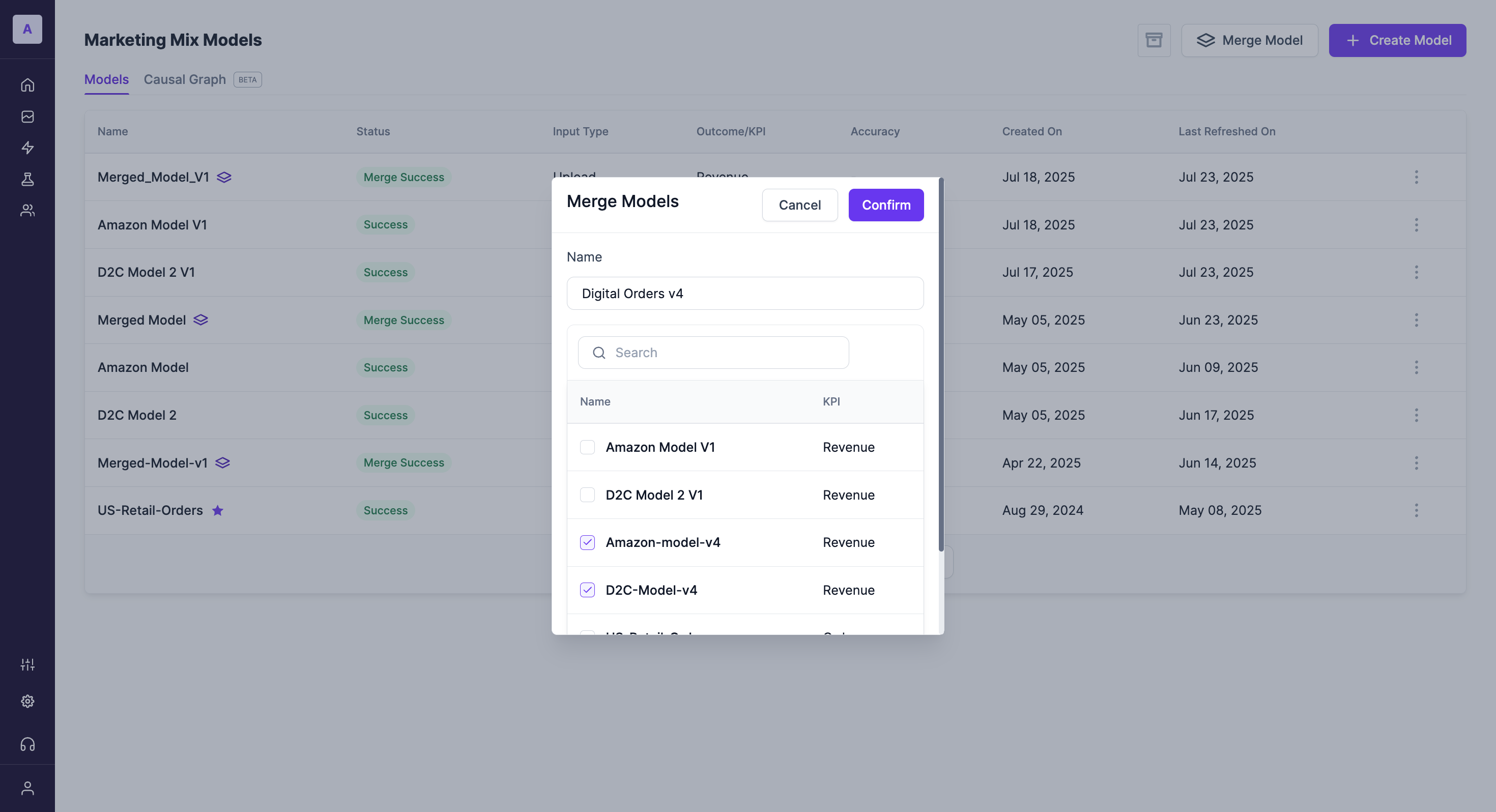 Model Selection PreconditionA shared outcome KPI (eg: Revenue, Orders, etc.) is a mandatory requirement for merging models. While selecting models for merge, ensure all models you intend to combine are aligned to the same KPI. This ensures the validity and accuracy of the resulting unified model.