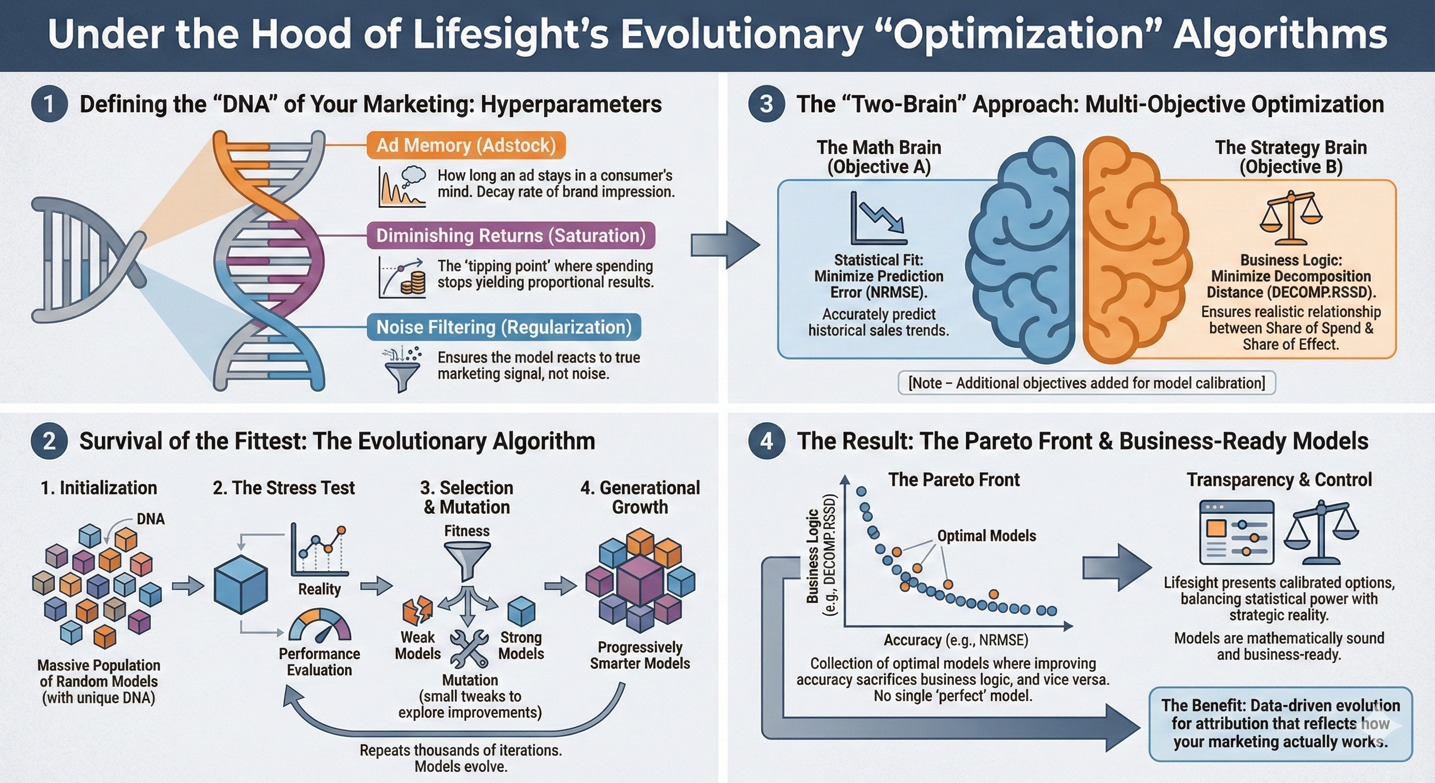 Lifesight’s modeling engine moves beyond simple regression. By utilizing Evolutionary Algorithms and Multi-Objective Optimization, we ensure that your model isn't just mathematically sound—it’s business-ready. We let the data evolve the solution, resulting in attribution that reflects how your marketing actually works.