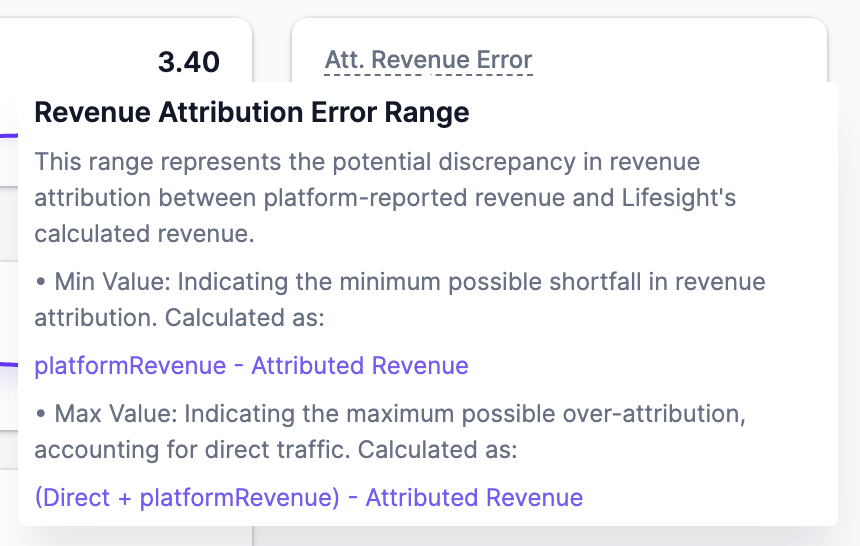(Direct Traffic + platformRevenue) - Attributed Revenue.This feature is designed to help users better understand the accuracy of platform-reported revenue figures, providing insights into the extent of revenue attribution errors.